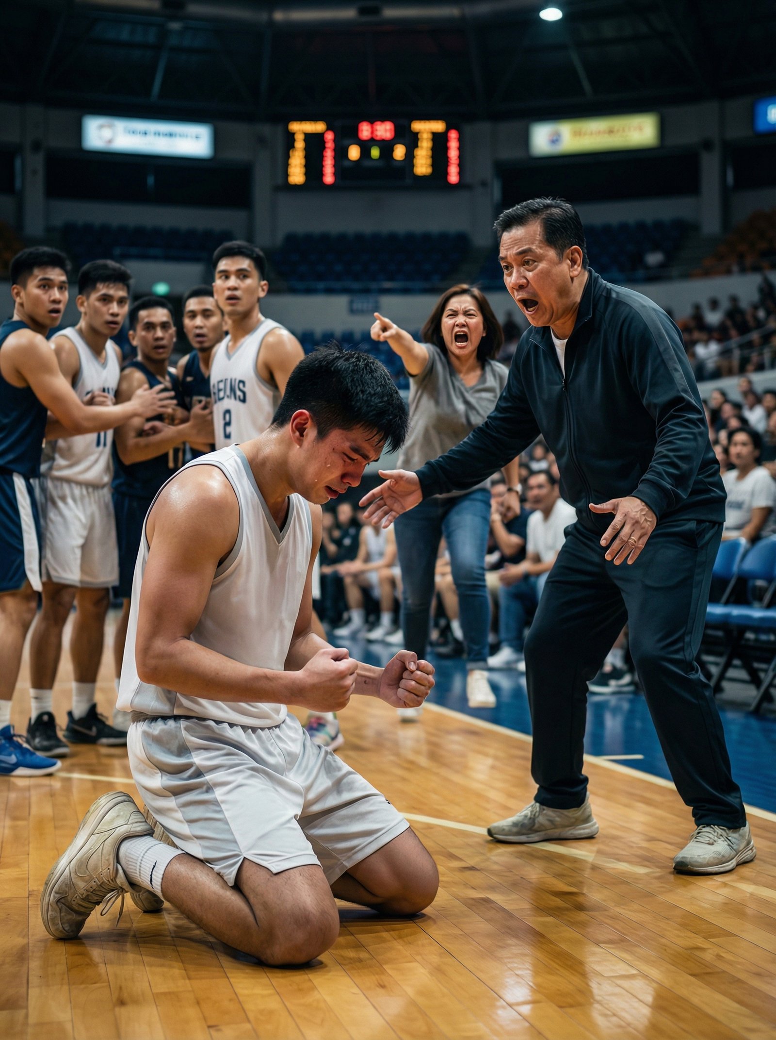 Isang reserbang manlalarong matagal nang tiniis ang sigaw, mura, at pagmamaliit ng sarili niyang coach ang walang habas na pinahiya at pinaluhod sa gitna ng court, sa harap ng mga kakamping napilitang tumahimik at ng mga taong unti-unting naniwalang wala nga siyang silbi, ngunit sa kasagsagan ng nakakapasong kahihiyang iyon, isang matinis na sigaw mula sa bleachers ang biglang humiwa sa buong arena, nagpahinto sa laro, nagpalingon sa lahat, at nagdulot ng sandaling ikinapanlamig ng lalaking kanina’y ubod ng yabang nang mabanaag niyang may katotohanang mas mabigat pa sa pagkatalo ang malapit nang pumutok.
