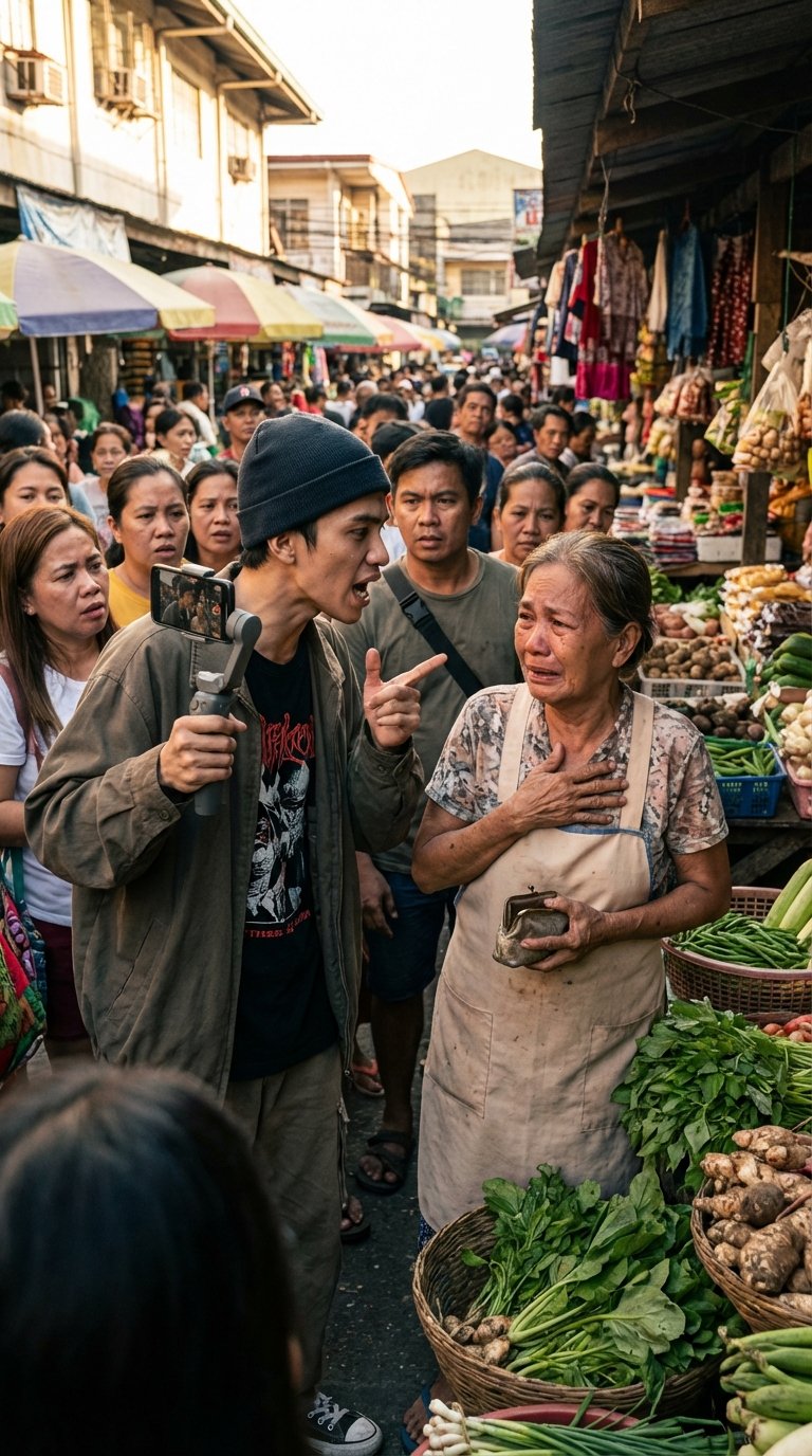 Isang matandang tindera sa gilid ng palengke ang ginawang katatawanan habang naka-camera ang lahat—pero nang may isang pangalan na nabanggit, biglang natuyo ang ngiti ng mapang-abusong vlogger… at doon nagsimulang bumigat ang hangin.