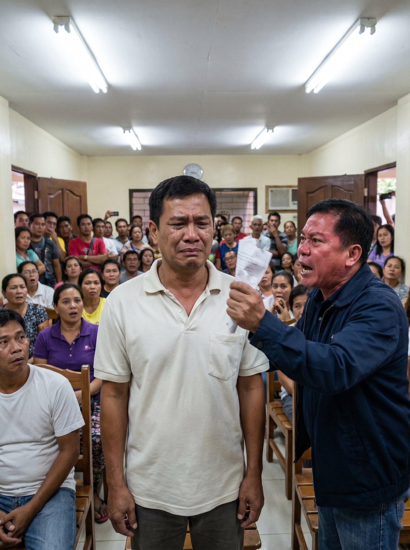 Sa ilalim ng mapuputing fluorescent light, sa gitna ng masikip na barangay hall na puno ng plastik na upuan, pawis, bulungan, at mga matang sabay-sabay na nakatutok sa harap, nakatayo si Ernesto na parang unti-unting nawawalan ng lakas sa sariling mga tuhod. Suot niya ang simpleng puting polo. Walang yabang. Walang depensa. Tanging luha lang na hindi na niya napigilan.