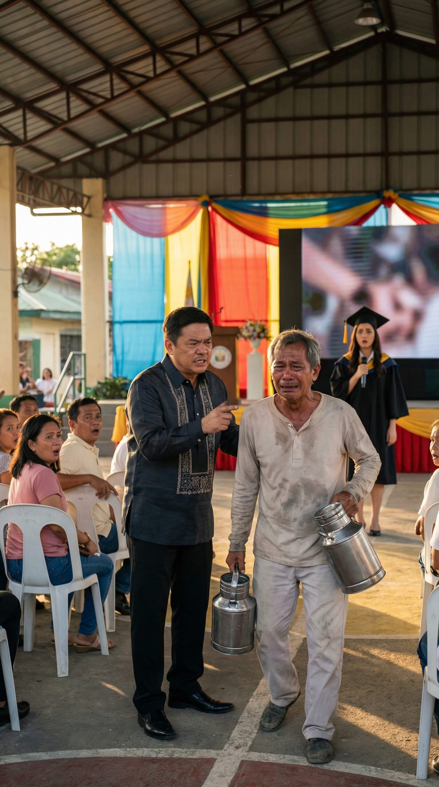 Pero bago pa man siya makalapit sa likod ng mga upuan, humarang na si Principal Renato Valdez. Mabilis ang lakad nito, matigas ang mukha, at matulis ang daliring nakaturo sa matanda na para bang may pinapalayas na hayop, hindi isang ama. Sa harap ng mga magulang at guro, walang pag-aalinlangan nitong sinabi na hindi palengke ang graduation at wala raw karapatang sirain ni Mang Tino ang seremonya gamit ang amoy-araw at mga dala nitong lalagyan. Natahimik ang paligid. May mga napalingon. May mga napasinghap. May ilang batang nakaupo sa gilid ng stage na biglang tumigil sa paggalaw.