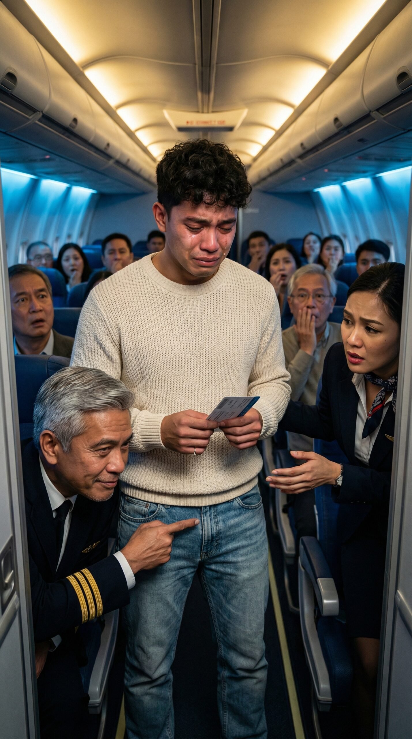 Bago pa makasagot ang attendant, sumingit ang piloto, mababa pero malinaw ang boses, yung boses na sanay sundin. “You’re blocking the aisle,” sabi niya, tapos tumingin siya mula ulo hanggang paa ng binata. “And that seat… is for premium passengers. Please move to the back. There must be a mistake.”