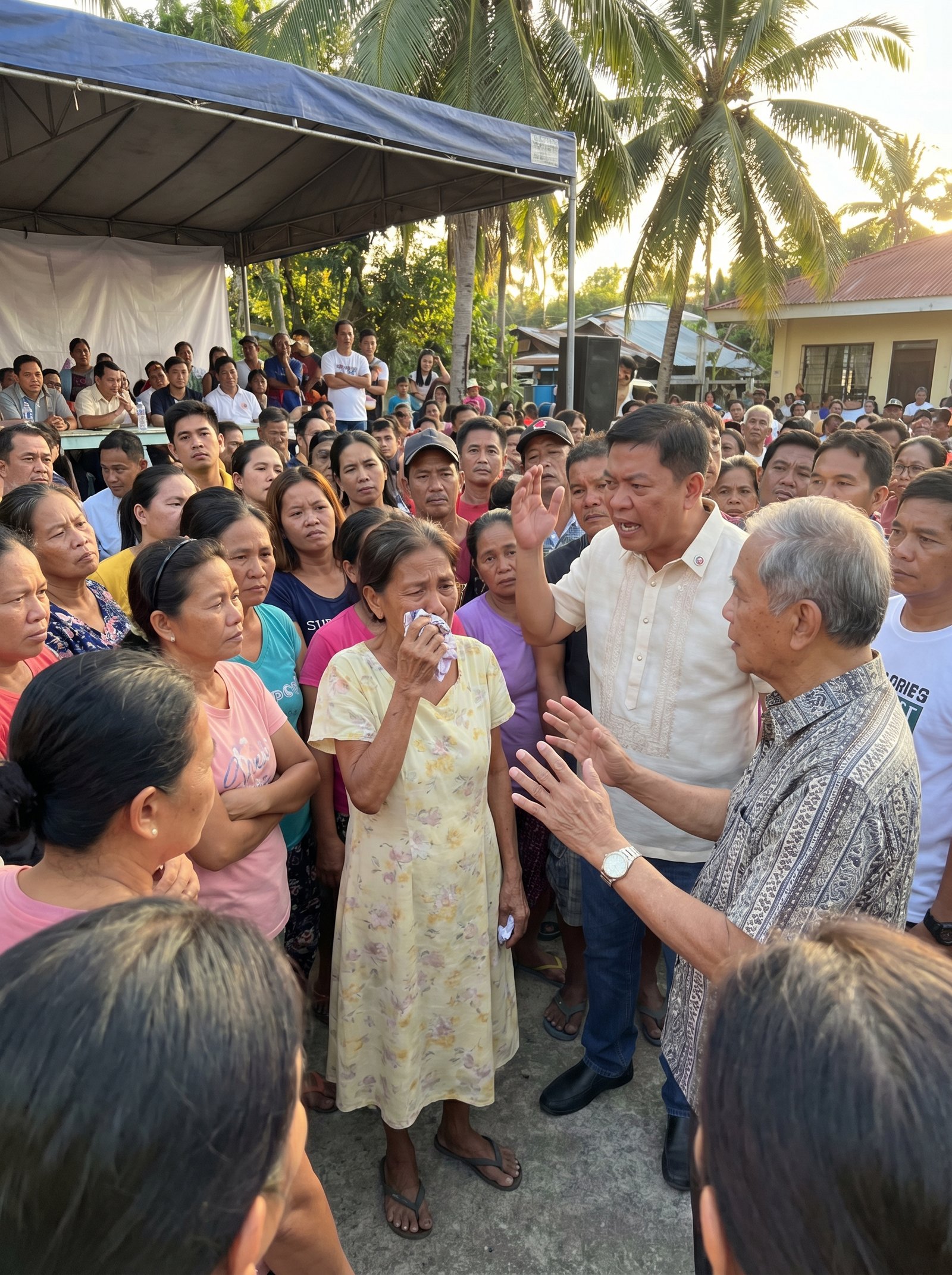 Hindi agad humupa ang ingay sa gitna ng barangay plaza nang itaas ng mayor ang kamay niya at magsalita nang may diin. Nasa gitna siya ng makapal na bilog ng mga tao, suot ang mapusyaw na barong, pawis ang noo, at matalim ang tingin na parang hindi na niya kayang paghiwalayin ang mga reklamo sa mga mukha ng mga taong kaharap niya. Sa paligid, siksikan ang buong barangay—mga nanay na naka-pambahay pa, mga lalaking galing trabaho, mga matandang nakasandal sa mga kasama, at mga kabataang nakikitingin sa likod. Sa kaliwa, may toldang asul na itinayo para sana sa barangay assembly. Sa likod, may speaker, mga plastik na upuan, mga bahay na tinatamaan ng papalubog na araw, at mga punong niyog na tahimik lang na nakatanaw sa gulong hindi na mapigil.