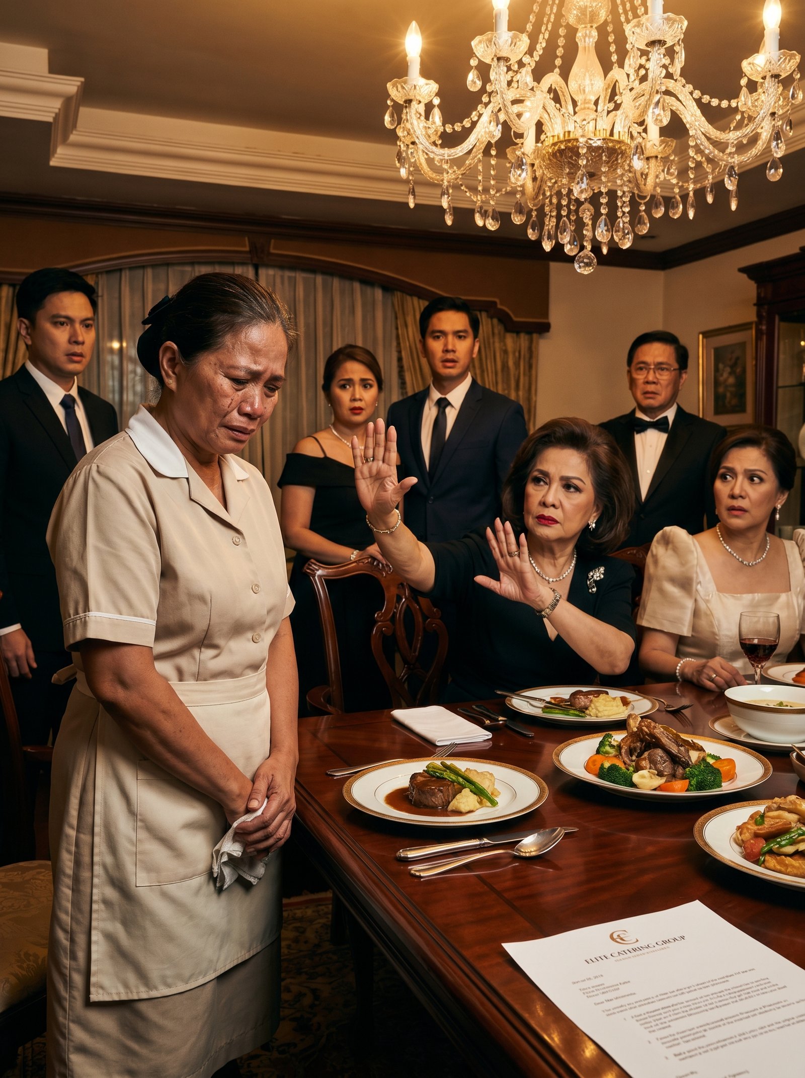 Hindi na niya halos maramdaman ang sariling mga paa sa haba ng pagtayo niya sa tabi ng hapag. Mula umaga, si Aling Rosa ang nag-ayos ng mesa, nagbuhat ng mga bandehado, nag-ayos ng kubyertos, at tumulong sa kusina para sa espesyal na hapunang inihanda ng pamilya Valderon. Sa ilalim ng malaking kristal na chandelier, kumikislap ang mamahaling pinggan, ang mga baso ng alak, at ang mga pagkaing maingat na inilatag sa mesa—karne na makintab sa sarsa, gulay na perpektong hiwa, at mga plato na parang hindi pagkain kundi dekorasyon. Sa gitna ng marangyang silid, si Aling Rosa naman ay nakatayo lang sa tabi, suot ang payak na unipormeng kremang-krema, hawak ang puting bimpo, at pilit nilulunok ang gutom na kanina pa kumakalam sa tiyan niya.