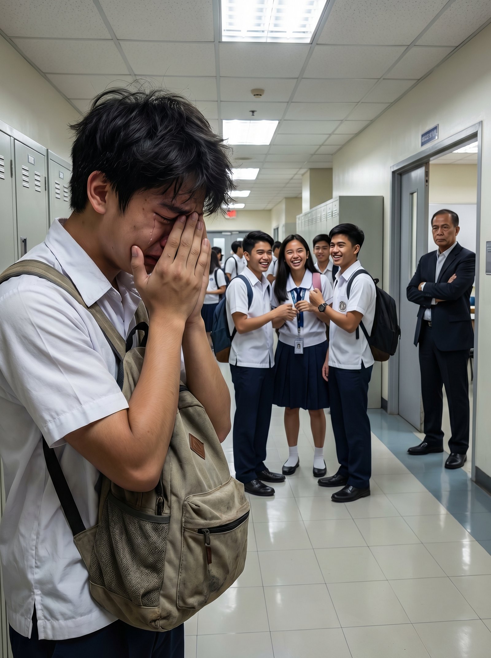 Hindi na malaman ni Adrian kung alin ang unang itatago niya noong sandaling iyon—ang mukha niyang basang-basa ng luha o ang lumang backpack na mariin niyang yakap sa dibdib na para bang iyon na lang ang natitira niyang depensa laban sa mga matang nanunuot sa kanya.