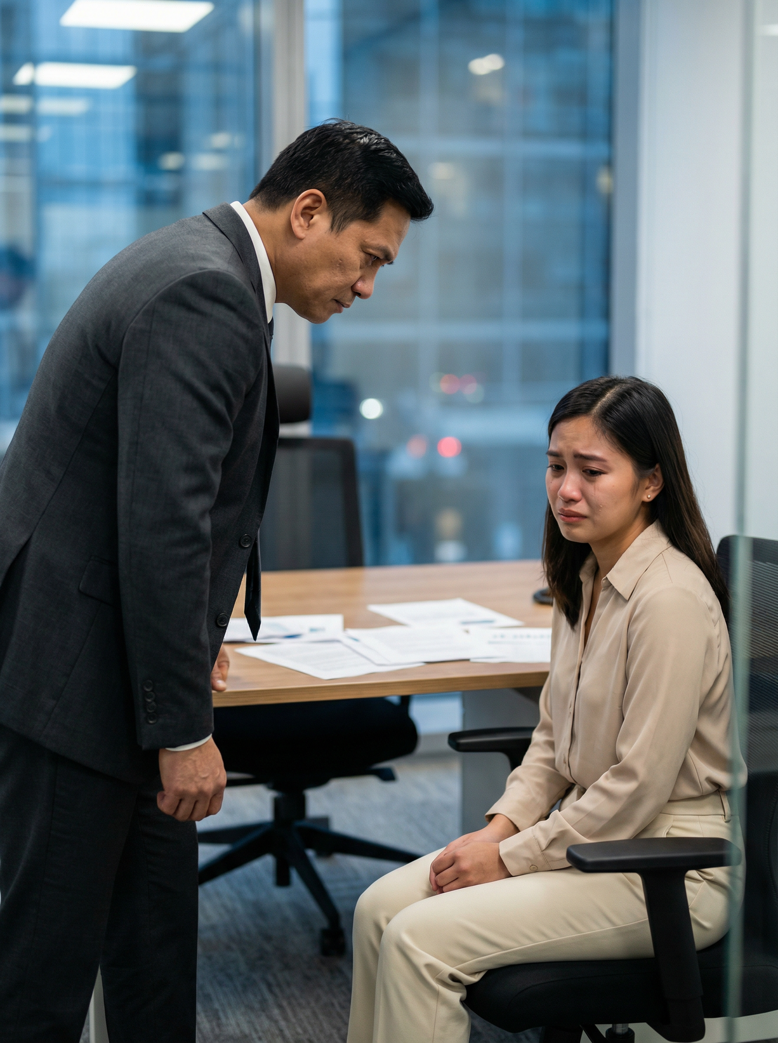 Tahimik lang siyang nakaupo sa itim na swivel chair sa loob ng glass meeting room, suot ang kremang blouse at plantsadong slacks na kaninang umaga ay tanda ng pag-asa, pero ngayo’y parang uniporme na ng isang taong unti-unting dinudurog. Sa ibabaw ng mahabang lamesa, kalat ang ilang papeles na kanina pa ipinupukol sa harap niya ng boss niyang si Mr. Serrano, isang lalaking sanay magsalita na parang bawat salita niya ay utos na hindi puwedeng tanggihan. Nakayuko ito sa harap niya, nakasandal ang dalawang kamay sa mesa, at ang mukha nito’y halos kasinlapit na ng takot na nanginginig sa dibdib ng dalaga. Sa labas ng salaming dingding, kita ang malamlam na liwanag ng lungsod at ang anino ng ilang empleyadong kunwaring abala, pero halatang nakikiramdam sa loob. Walang pumapasok. Walang sumasabat. Lahat ay sanay nang may umiiyak sa kwartong iyon, basta hindi sila ang nakaupo sa upuang iyon.