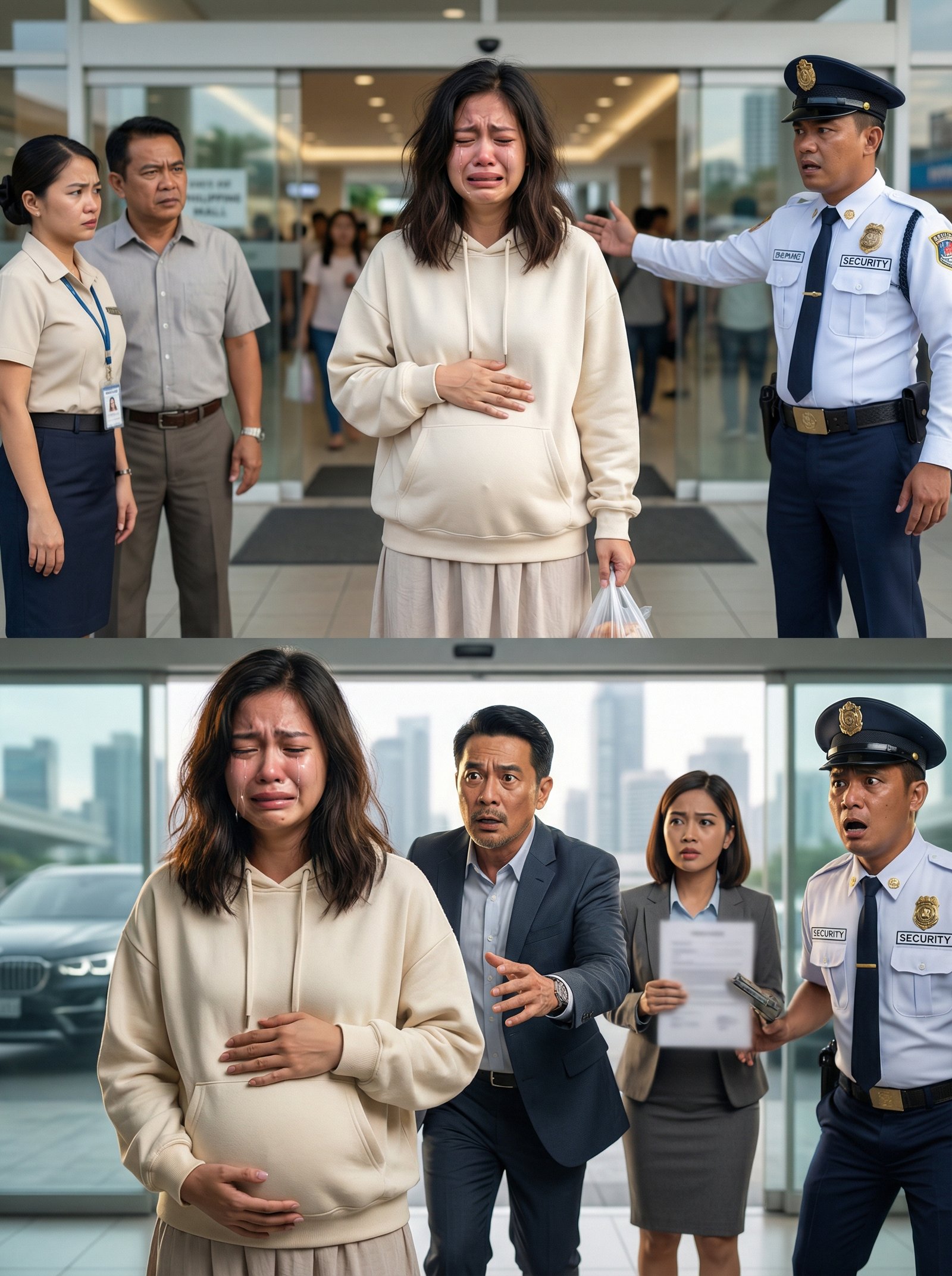May mga araw na ang kahihiyan ay mas mabigat pa sa tiyan ng buntis. Sa harap ng isang malaking gusali na may salaming pinto at malamig na ilaw sa loob, may isang babae na nakatayo—naka-hoodie na kulay cream, maga ang mata sa kakaiyak, at isang kamay na mahigpit na nakapatong sa kanyang tiyan na parang binabantayan ang pinakamahalagang buhay sa mundo. Sa kabila ng kanyang katahimikan, may ingay na pumapalibot: isang security guard na nakaturo at nag-uutos, isang empleyadang nakasimangot, isang lalaking nakatingin na parang may hinuhusgahan, at mga matang nakadikit sa kanya na parang siya ang problema. Hawak niya ang isang maliit na plastic bag—hindi mamahaling gamit, hindi designer, kundi simpleng bitbit ng taong naglalakad nang malayo. At sa araw na iyon, ang “buntis na pulubi” na pinagtatabuyan nila… ay may dalang lihim na kayang yumanig sa buong bilyonaryong mundo.