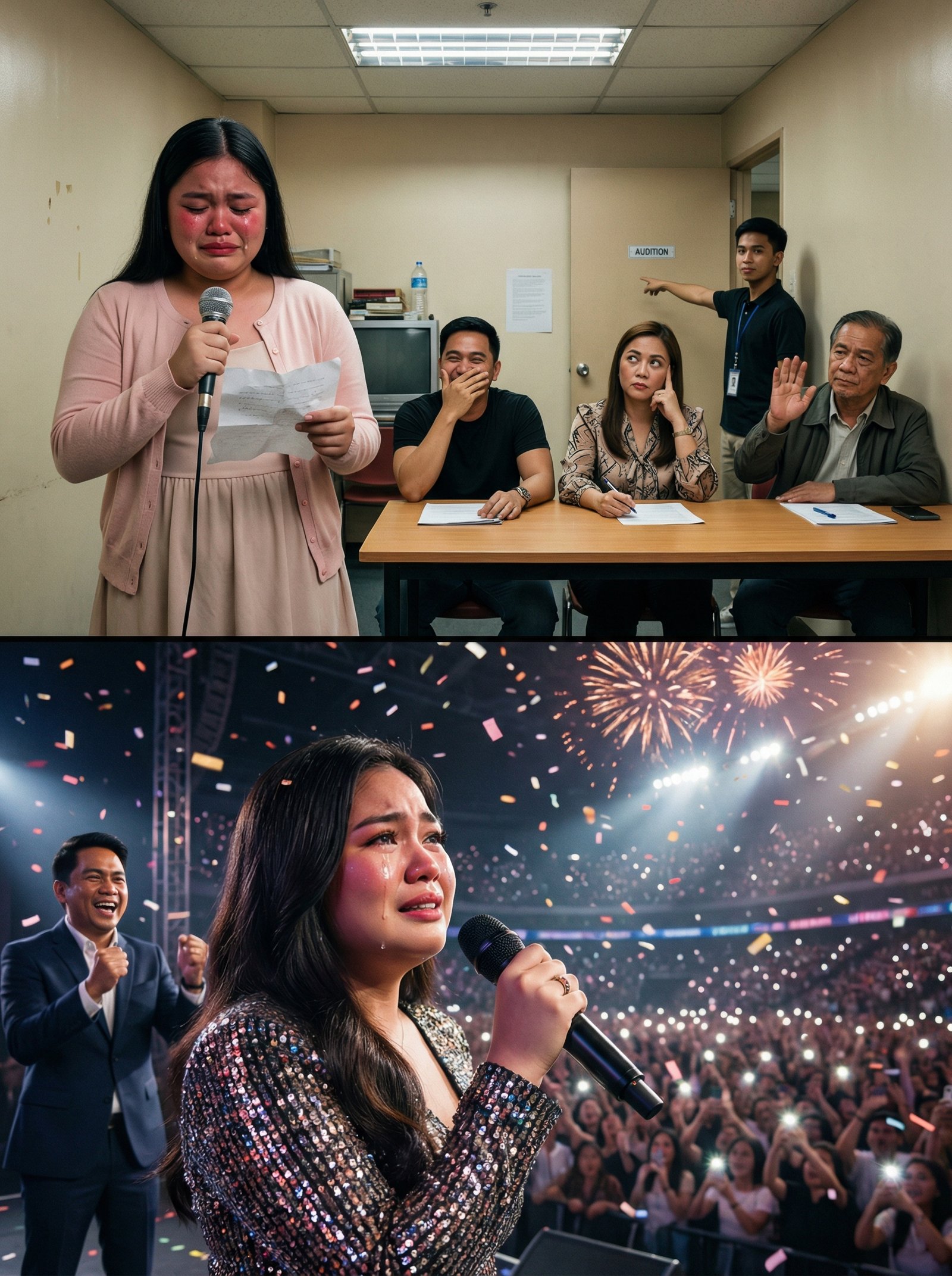At kinabukasan, ginawa niya ang bagay na hindi niya inasahan: kinuha niya ang lumang cellphone ng kapatid niya, nag-record siya sa maliit na kwarto, at in-upload niya ang kanta—walang studio, walang autotune, walang glam. Isang boses lang, luha pa sa mata, at isang mensaheng nakasulat sa caption: “Pinatigil nila ako sa audition. Pero hindi nila kayang patigilin ang pangarap ko.”