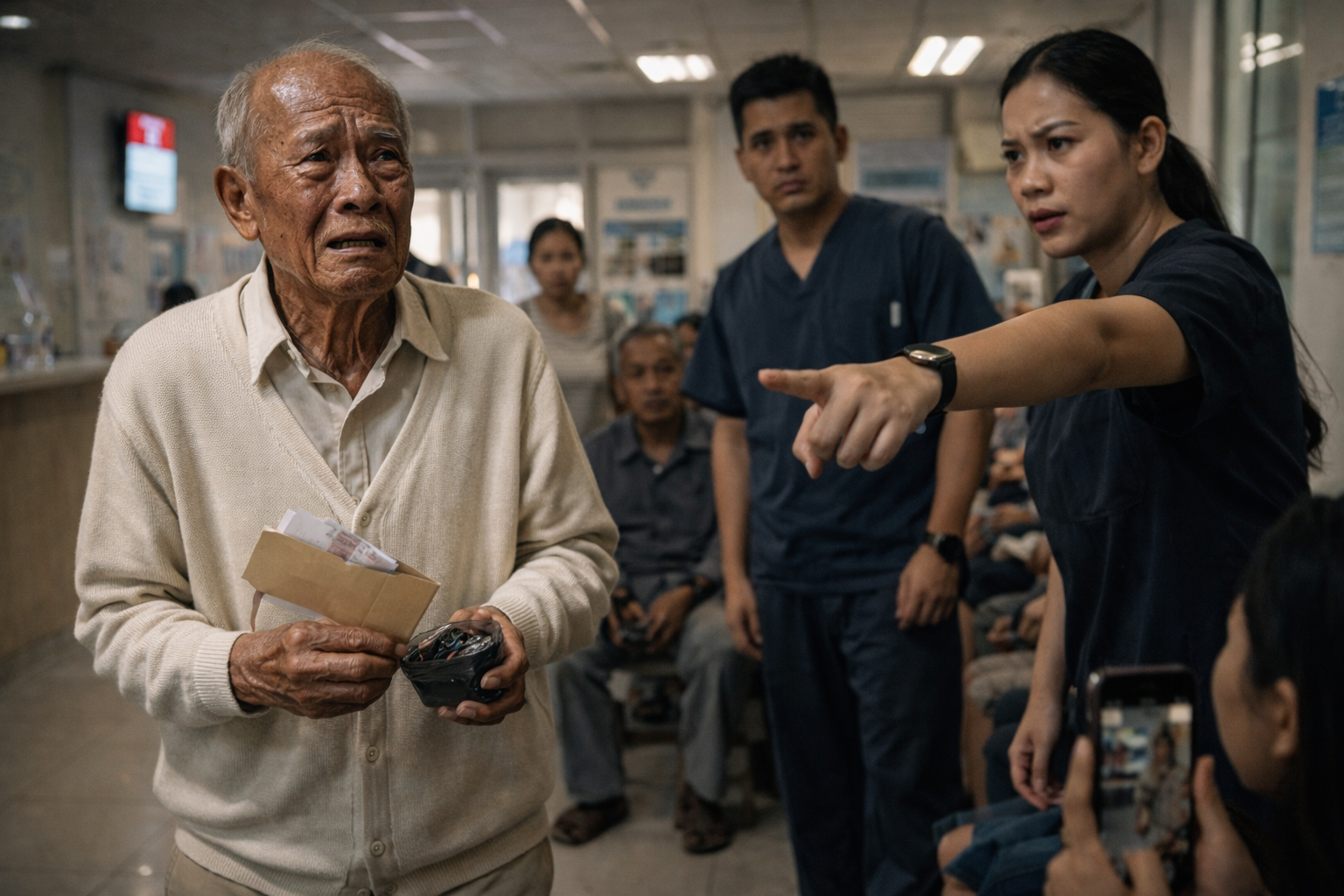 Sa mismong sandaling itinutok ng babae ang daliri niya—hindi para magturo ng direksyon, kundi para magturo ng kaparusahan—nanginig ang hangin sa loob ng clinic. Parang mas humigpit ang liwanag ng fluorescent, mas lumakas ang ingay ng bentilador, at mas tumalas ang amoy ng antiseptic. Sa gitna ng waiting area na punô ng nakaupong pasyente, may isang matandang lalaki na halos hindi na maitago ang panginginig ng labi. Hawak niya ang sobre na gusot, at sa kabilang kamay, isang maliit na lalagyan na parang pinag-ipunan ng huling barya. Ang tanong ay isa lang: hanggang kailan natin hahayaang maging normal ang pagtaboy sa taong walang pera?