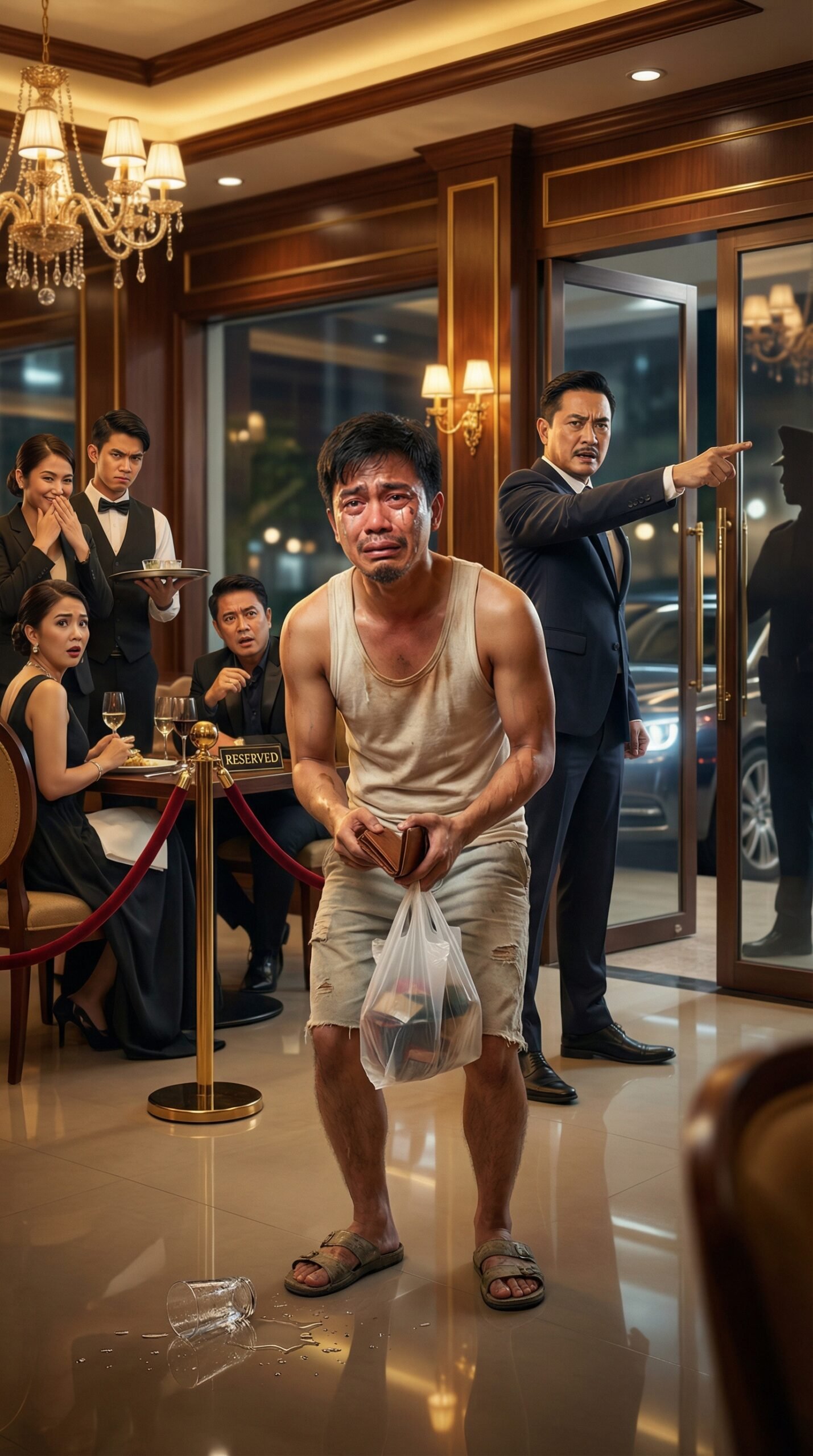 Sa loob ng isang mamahaling restaurant na may gintong ilaw at kristal na chandelier, may lalaking nakatayo sa gitna ng dining area. Naka-sando siya, kupas, bahagyang marumi, at ang shorts niya’y halatang pinagtiyagaan lang. Basa ang mukha niya sa luha, namumula ang mata, at nanginginig ang bibig na pilit lumulunok ng hiya. Sa isang kamay, hawak niya ang plastic bag na may laman na tila pagkain o gamit. Sa kabila, isang lumang wallet na halos wala nang laman, parang simbolo ng araw na kapos na kapos siya.