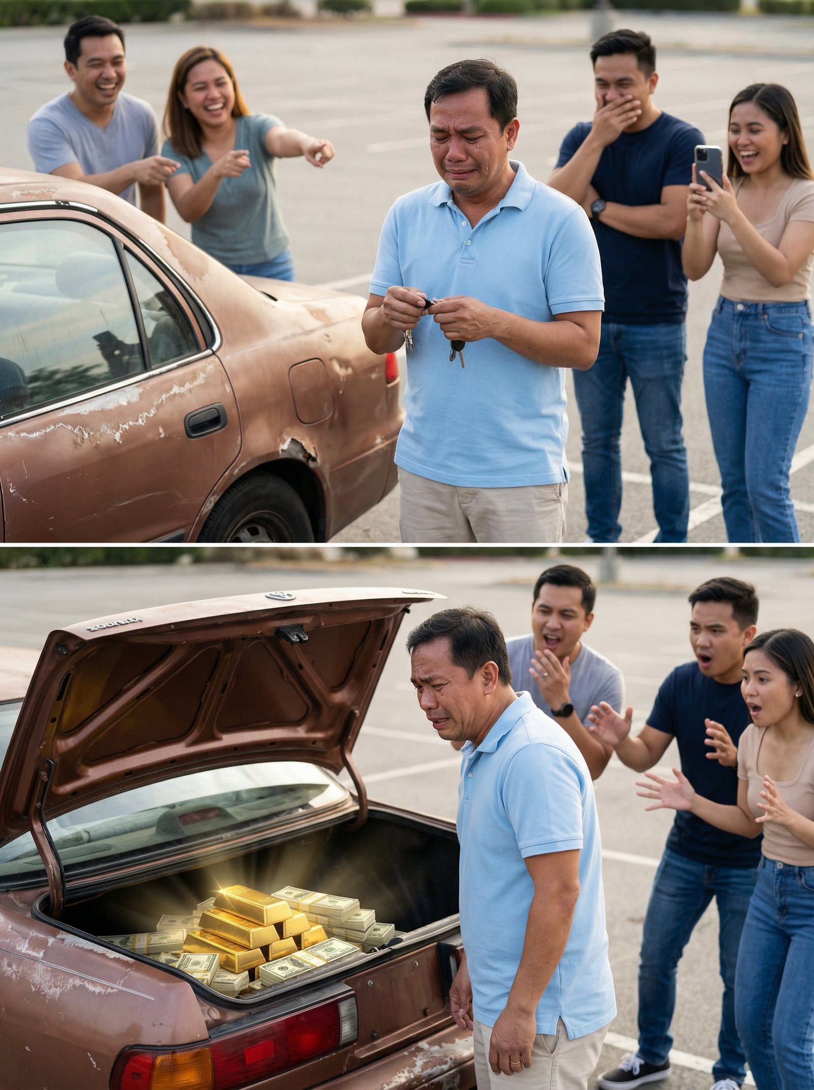 May mga araw na akala mo, simpleng kahihiyan lang ang aabutin mo—tatawanan ka, kukutyain, tapos uuwi kang may bigat sa dibdib. Pero may mga araw na ang mismong kahihiyang ‘yon ang magiging pintuan ng isang katotohanang hindi kayang intindihin ng mga taong sanay tumingin lang sa kalawang. Sa parking lot na halos walang laman, isang lalaking nasa edad na ang tumayo sa tabi ng lumang kotse—kupas ang pintura, gasgas ang gilid, at parang bawat kalampag ng pinto ay nagsasabi ng “wala akong ipagmamalaki.” Sa likod niya, apat na tao ang nagtatawanan, nagtuturo, at nagre-record pa sa cellphone. Ang tanong: ano ang mas mabigat—ang pagtawa nila… o ang sikreto sa trunk na matagal nang nakatago?