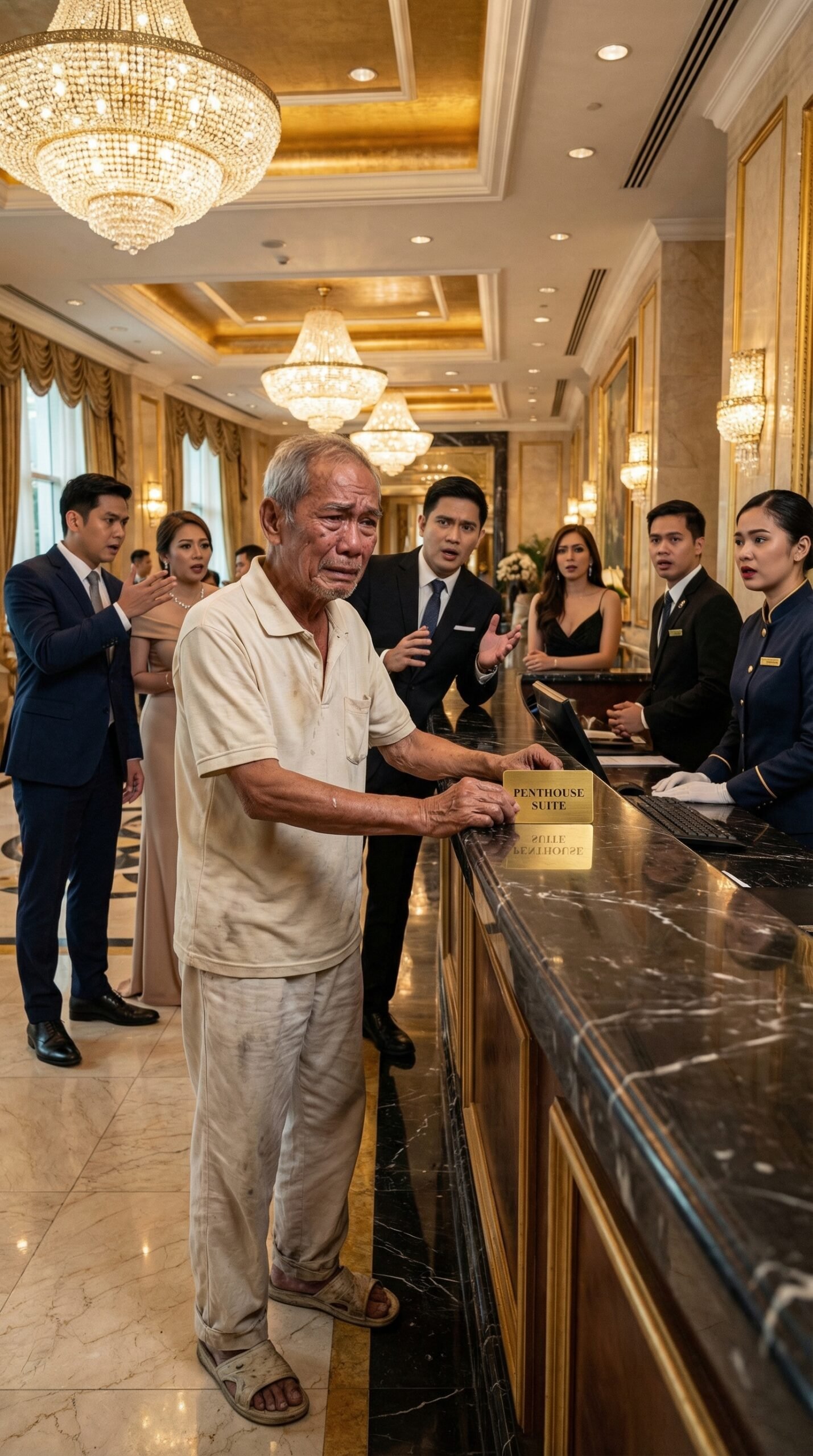 Sa ilalim ng naglalakihang chandelier at ginintuang kisame ng hotel lobby, sa pagitan ng makikintab na haligi at marmol na sahig na parang hindi kailanman nadudumihan, dahan-dahang lumapit sa front desk ang isang matandang lalaki na ang suot ay kupas na polo, gusot na pantalon, at lumang tsinelas na halatang ilang ulit nang tinahi para lang magtagal. Basa ang gilid ng manggas niya sa pawis. May bahid ng alikabok ang laylayan ng damit niya. At sa mukha niyang nilulumot ng pagod, may isang tahimik na lungkot na para bang malayo ang nilakbay niya bago makarating sa lugar na iyon. Sa likod ng mamahaling reception counter, nakatayo ang mga staff na nakaayos ang pustura, plantsado ang uniporme, at bihasang ngumiti sa mga bisitang mahalaga sa hotel. Ngunit nang makita nila ang matanda, may kung anong pagbabago sa kanilang mga mata. Hindi takot. Hindi awa. Kundi yaong pamilyar na tingin ng mga taong mabilis humusga. Sa isang sulok, may dalawang bisitang naka-formal ang napatingin at nagbulungan. Sa gilid, ang isang lalaking naka-asul na suit ay napataas ang kilay, habang ang babaeng katabi niya ay napahawak sa dibdib na parang may kakaibang eksenang biglang sumulpot sa gitna ng eleganteng gabi. Wala pang nagsasalita, pero naroon na agad ang hatol. Hindi bagay ang matanda sa lugar. Iyon ang sigaw ng katahimikan sa paligid.
