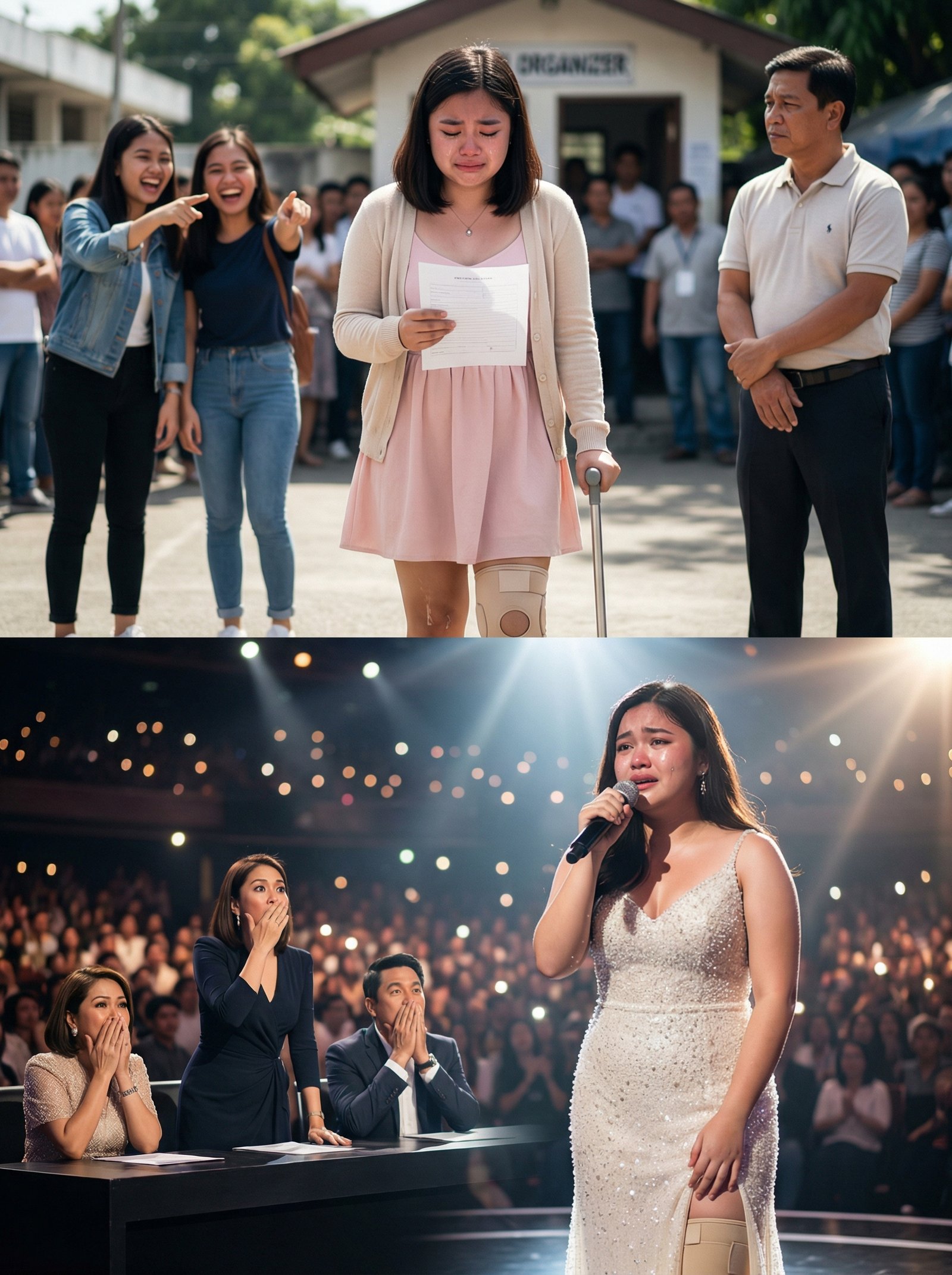 Maliwanag ang ilaw. Napakalaki ng venue. Sa harap, isang dagat ng tao—mga cellphone na kumikislap, mga mukha na naghihintay ng entertainment. Sa gilid, naroon ang judges’ table—tatlong tao, pormal ang suot, sanay sa talent, sanay sa gulat. Sa backstage, naroon si Mara, nakasuot ng puting gown na kumikintab sa ilaw. Sa binti niya, malinaw ang brace—hindi niya itinago. Sa kamay niya, wala na ang tungkod; ngayon, ang hawak niya ay microphone.