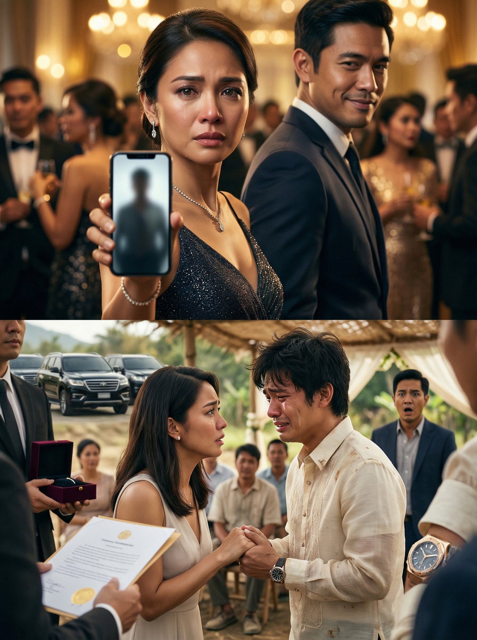 Sa gabing punô ng kristal na ilaw at pekeng halakhak, isang babae ang nakatayo sa gitna ng ballroom na parang reyna—pero ang mga mata niya, basang-basa sa katotohanang matagal niyang itinago. Sa isang kamay, hawak niya ang cellphone na nakaharap sa lahat, ipinapakita ang isang litrato sa screen—malabo ang mukha, pero malinaw ang mensahe: may lihim na magpapabagsak ng reputasyon, magwawasak ng tiwala, at magbubukas ng sugat na hindi kayang takpan ng mamahaling gown. At sa likod ng mga luha niya, nakatayo ang lalaking minsang minahal niya—nakangiti, kalmado, tila nananalo—na parang alam niyang kahit umiiyak siya ngayon, siya pa rin ang may hawak ng kwento.
