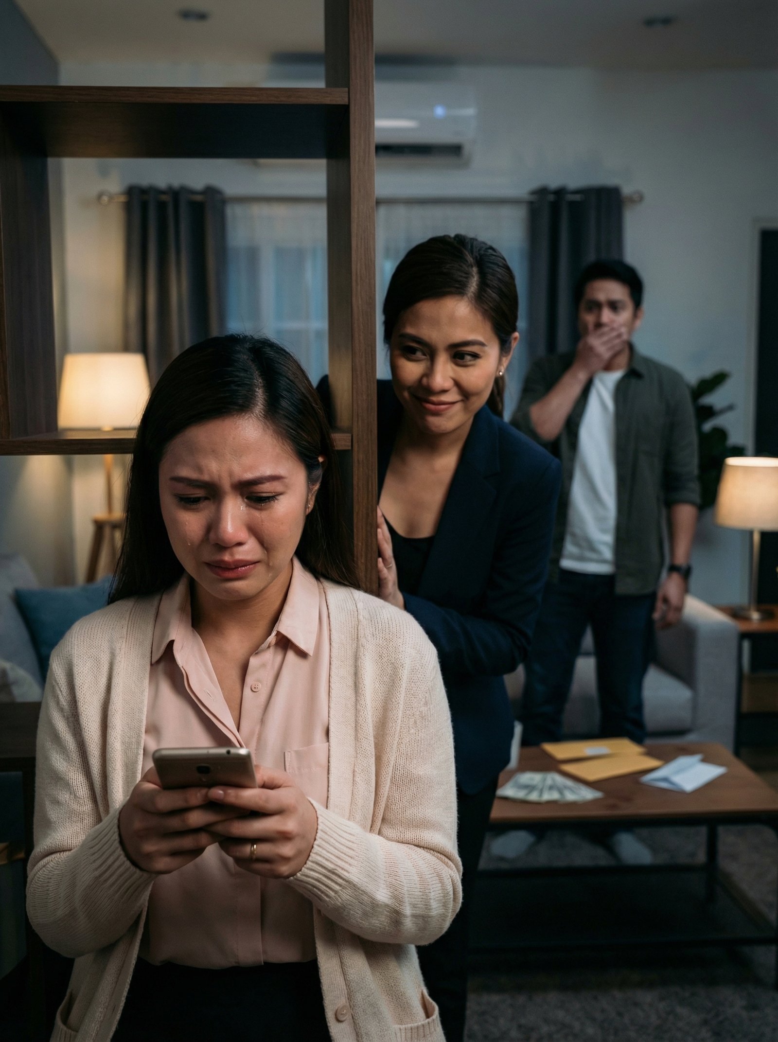 Hindi niya na halos makita ang screen ng cellphone sa tindi ng luha sa mga mata niya, pero pilit pa rin niya itong hinawakan nang mahigpit, parang sa maliit na ilaw lang na iyon nakasabit ang huling katotohanang kaya pang magligtas sa kanya. Nakatayo siya sa gilid ng kahoy na divider sa sala, suot ang maputlang cardigan sa ibabaw ng blouse niyang gusot na sa kakapunas ng luha. Sa likod niya, may dalawang ilaw na nagpapainit sa kwartong hindi na mainit ang pakiramdam. Sa mesa sa gitna ng sala, may nakabukas na brown envelope at ilang perang nakakalat na para bang tahimik na saksi sa gulong kakaputok pa lang. Sa may sofa, nakatayo si Marco, maputla, napapatakip sa bibig na tila hindi makapaniwala sa nangyayari. At sa kabilang gilid ng divider, bahagyang nakasilip ang matalik niyang kaibigang si Sheila, nakasuot ng dark blazer, may ngiting pilit itinatago pero hindi maitago sa mga mata. Ngiting akala nito ay siya na ang panalo.