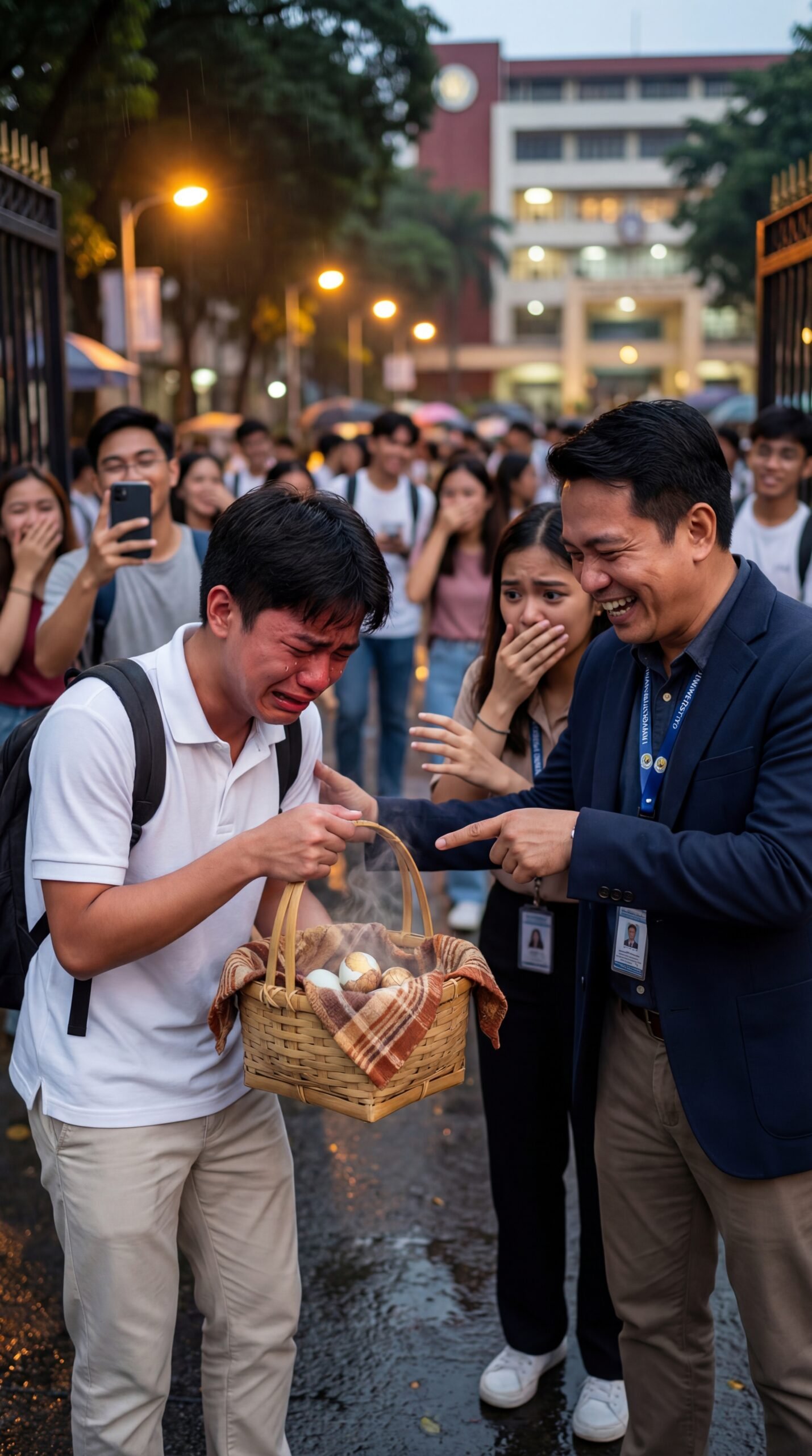 Sa isang maulang hapon sa loob ng campus, may mga pangarap na nababasa hindi lang ng ulan—kundi ng pangungutya. Sa tapat ng malaking gate ng unibersidad, habang naglalakad ang mga estudyante sa ilalim ng mga streetlight na nag-iilaw sa basang kalsada, may isang binatang nakayuko, umiiyak nang hindi na maitago. Suot niya ang simpleng puting polo, nakasabit ang backpack sa balikat, at sa kamay niya, bitbit ang isang bayong na may nakabalot na tuwalya—sa loob, may mga itlog na mainit pa, may usok na pumapait sa hangin, parang mismong pagod niya ang umaakyat sa langit.
