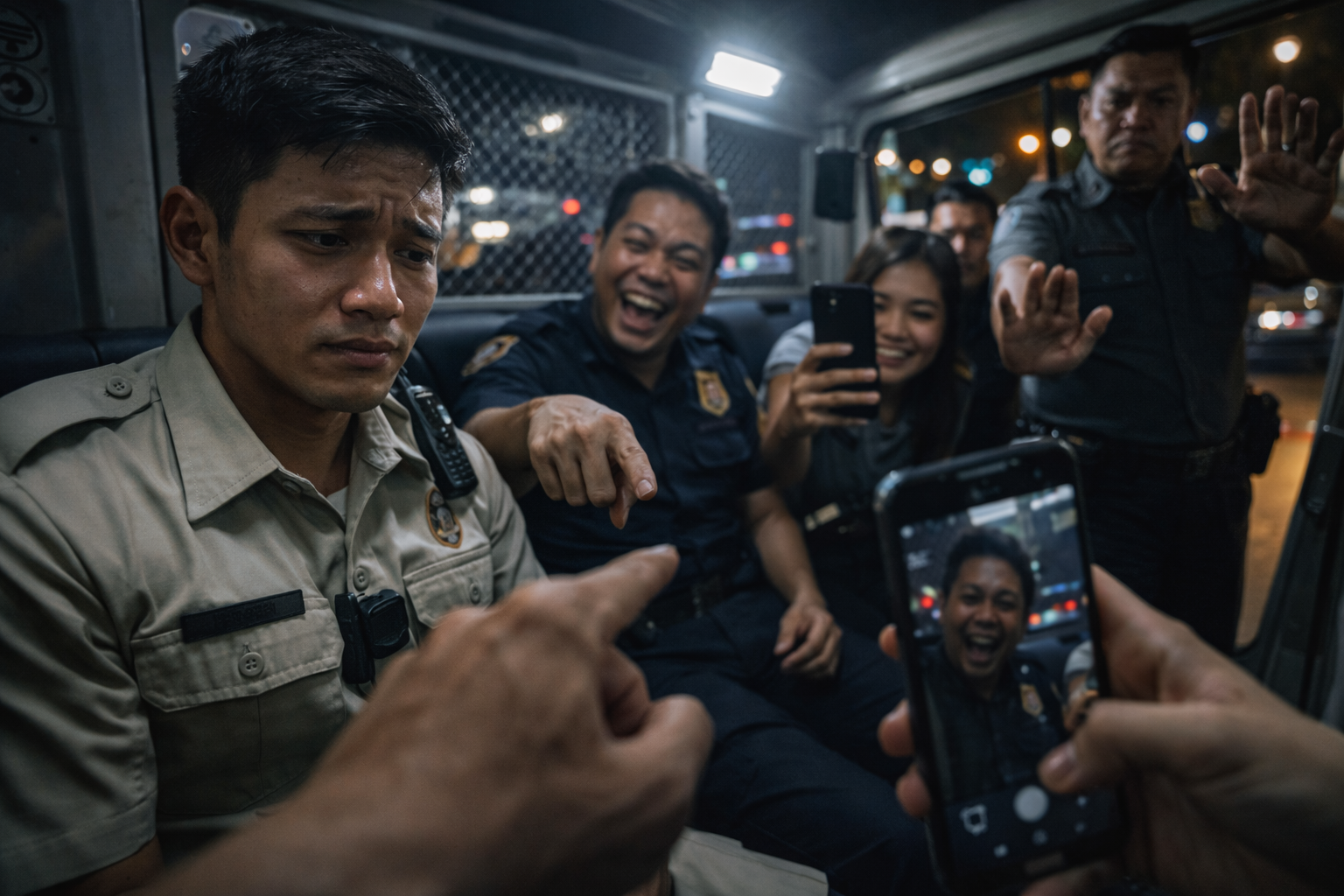 Sa tapat niya, isang daliri ang nakaturo—malapit, mapanukso, at may kasamang tawa na tumatama sa rehas ng bintana at bumabalik sa loob ng van na parang paulit-ulit na sampal. Sa likod, dalawang pulis ang halos magkasabay tumatawa; isa’y nakanganga sa tuwa, isa naman ay nakangiting kumukuha ng video gamit ang cellphone, sabik na sabik na gawing eksena ang pagkatalo ng kapwa nila. Sa dulo, may isang mas matandang pulis na nakataas ang palad na parang traffic enforcer—hindi para tumigil ang bullying, kundi para pigilan ang sinumang aawat. Sa labas ng bintana, kumikislap ang ilaw ng siyudad—pero sa loob, tila mas madilim ang mundo.