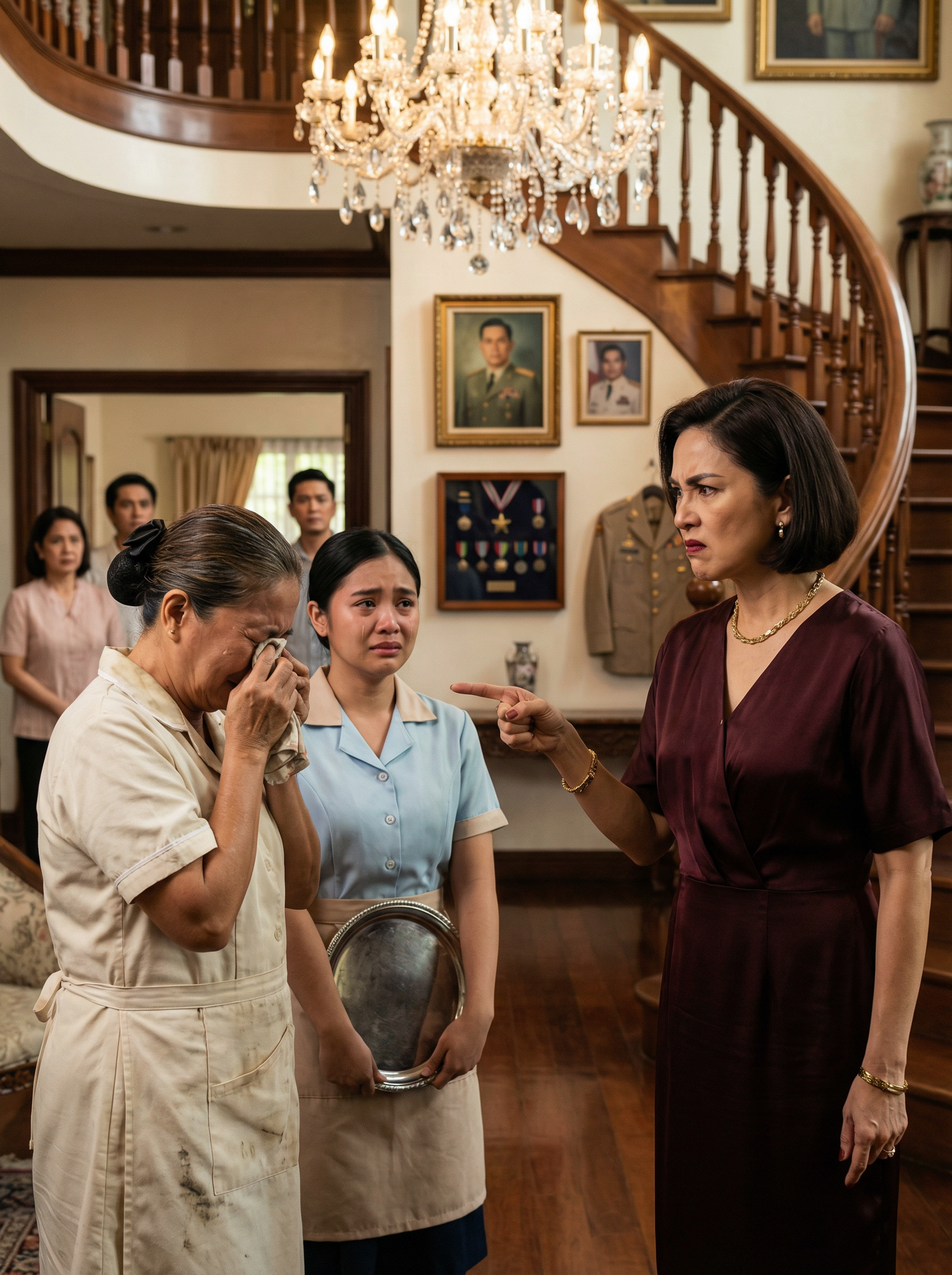 Hindi na halos maitaas ni Aling Belen ang mukha niya sa tindi ng panginginig ng dibdib niya habang nakatapal ang basahang kamay sa mga mata niyang punong-puno ng luha. Sa gitna ng malawak na sala ng mansyon, sa ilalim ng kristal na chandelier at sa harap ng mga retratong nakasabit sa dingding ng mga lalaking nakauniporme at punong-puno ng medalya, nakatayo siyang tila isang munting anino habang ang ginang ng bahay na si Veronica Montenegro ay walang habas na nakaturo sa mukha niya. Nakasuot si Veronica ng mamahaling damit na kulay alak, maayos ang buhok, matalim ang tingin, at ang boses ay punong-puno ng yabang ng isang babaeng matagal nang sanay na lahat sa paligid niya ay yumuyuko sa pangalan ng asawa niyang sundalo. Sa tabi ni Aling Belen, halos hindi makahinga si Lira, ang batang kasambahay na may hawak pang pilak na bandehado, bakas ang takot at awa sa namumulang mga mata. Sa likod nila, nakatigil ang ibang tauhan ng bahay, at kahit walang nagsasalita, dama sa hangin ang bigat ng mga salitang kanina pa ibinabato ni Veronica.