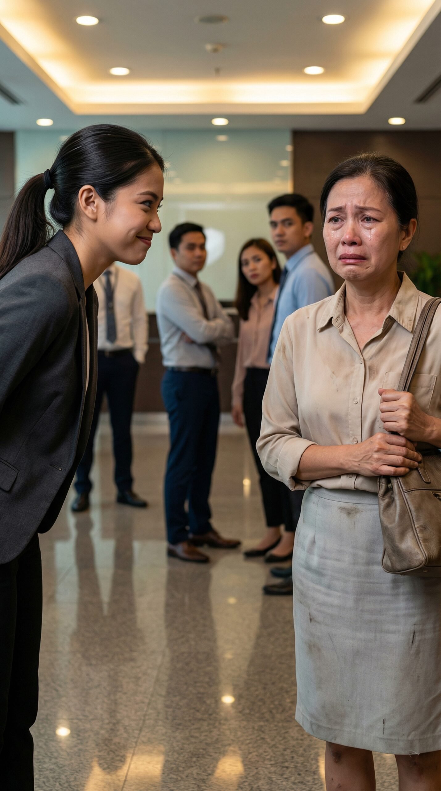 Sa unang tingin, parang simpleng eksena lang ito sa lobby ng isang mataas na gusali—makintab ang sahig, malamig ang ilaw ng recessed ceiling, at tahimik ang hangin na parang laging may nag-aabang na desisyon. Pero sa gitna ng kintab, may isang bagay na hindi kayang takpan ng marble at salamin: ang luha. At ang tanong ay isa lang—ilang segundo ang kailangan bago malaman ng isang taong mapanghamak na mali ang pinagtawanan niya?