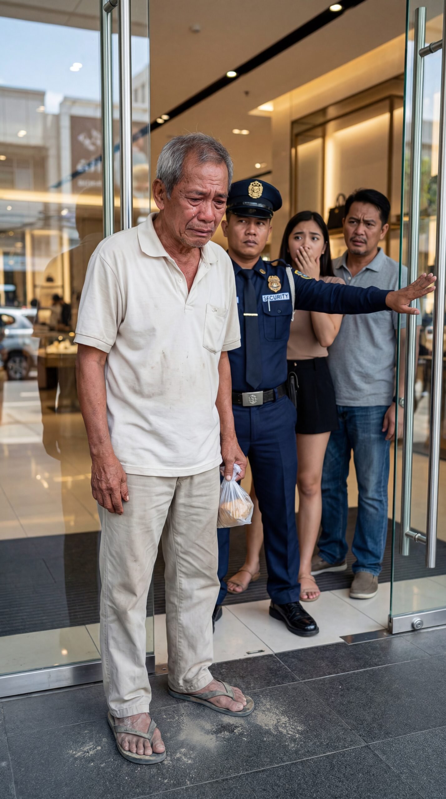 Sa mismong bungad ng mall—sa pagitan ng malalaking salamin na pintuan at ng malamig na liwanag sa loob—may isang matandang lalaking nakayuko ang balikat, nangingilid ang luha, at pilit nilulunok ang hiya habang dahan-dahang humahakbang palabas. Naka-tsinelas siya, kupas ang damit na kulay kremang polo at pantalon, at sa kamay niya ay may maliit na supot na plastik na may lamang tinapay o pagkain—parang iyon lang ang dala niyang yaman sa araw na ito. Sa likod niya, nakatayo ang isang security guard na naka-uniporme, nakataas ang isang kamay na parang pader, malinaw ang mensahe: “Huwag ka nang pumasok.” Sa loob ng pintuan, may babae na nakatakip ang bibig sa gulat, at may lalaking nakakunot-noo na tila hindi makapaniwala sa nangyayari. At ang tanong na bumibigat sa hangin: ano ang kasalanan ng isang matanda para itaboy sa lugar na dapat bukas para sa lahat?