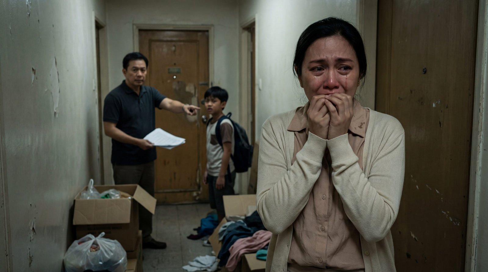 Sa unahan, isang babae ang nakatayo malapit sa pintuan, nangingilid ang luha, nangingitim ang mata sa pagod at takot. Nakaputing cardigan siya at mapusyaw na blouse, pero wala sa damit ang bigat—nasa dibdib niya. Sa likod niya, may lalaking naka-itim na polo na may hawak na mga papel, itinuturo ang pinto na para bang may hatol na nakasulat doon. At sa gitna nila, isang batang lalaki na may backpack, nakatigil na parang naliligaw sa sarili niyang bahay—bahay na biglang naging lugar ng pagpapaalis.