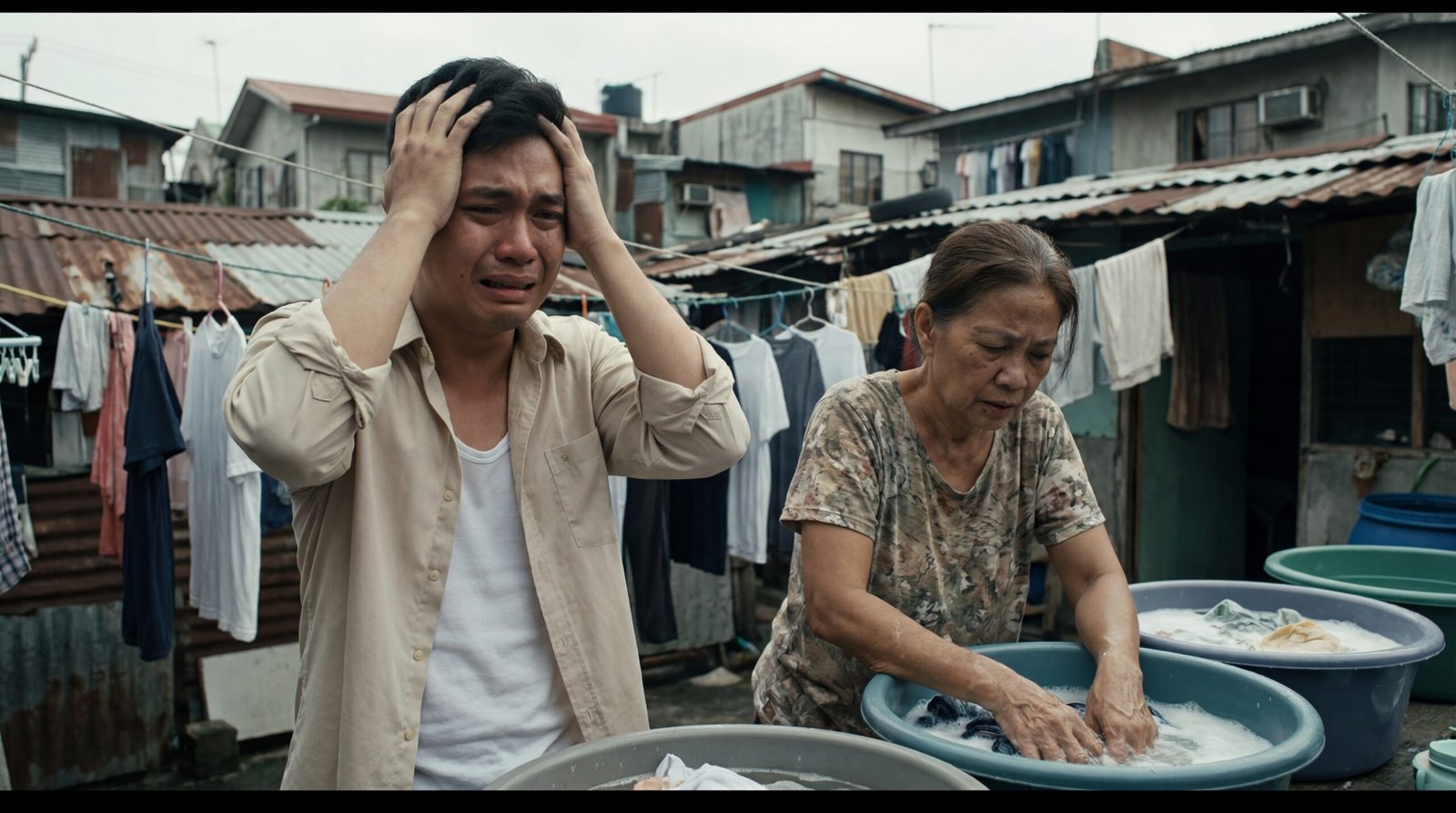Pero si Marco, hindi na nakapaghintay. Lumapit siya, at sa bawat hakbang, mas lumalakas ang ingay ng pagkadurog sa loob niya. Nakita niya ang balat ng kamay ng ina—magaspang, kulubot sa tubig, may maliliit na sugat na parang pinaso ng sabon at pagod. Nakita niya ang mga damit na nakapatong sa gilid: polo na hindi nila sukat, kumot na masyadong mahal para sa kanila, uniform na may pangalan ng ibang tao. Nakita niya ang hangin na punô ng amoy ng basang tela at detergent.