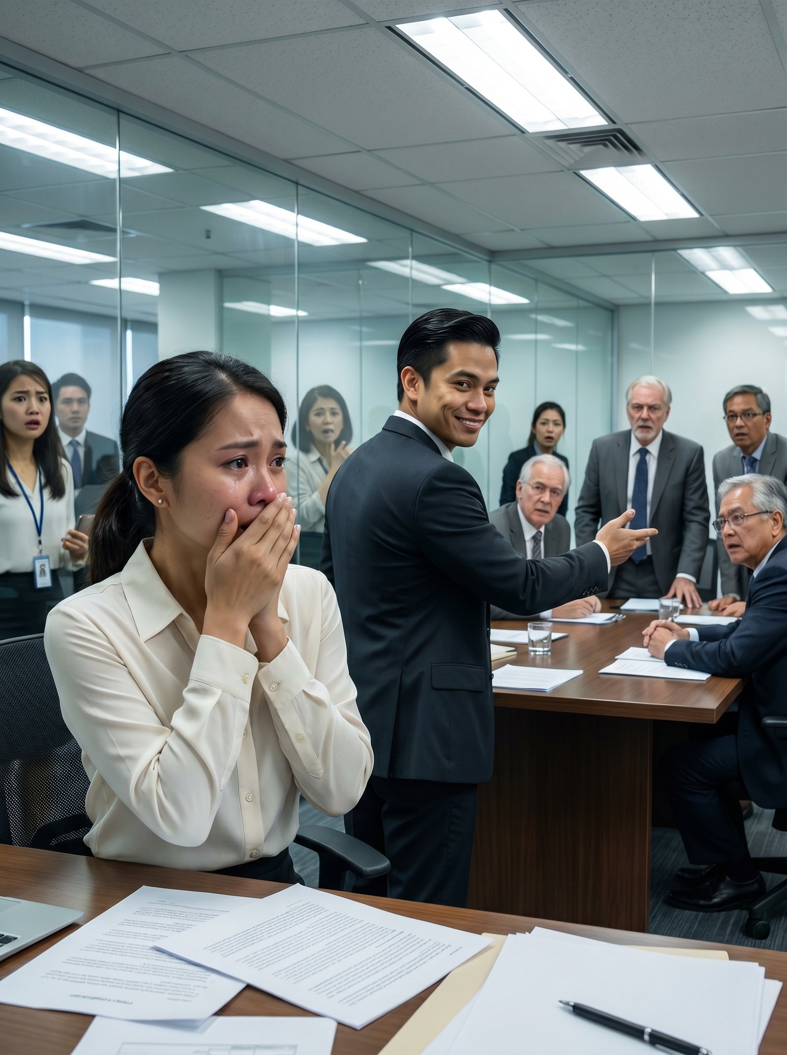 Sa ibabaw ng mesa, nakakalat ang mga dokumento. May printouts. May proposals. May mga papel na pinaghirapan niya sa loob ng maraming buwan. Sa dulo, may mga matatandang board member na kanina pa nakatitig sa kanya na para bang isang maling hakbang lang ang kulang para tuluyan siyang malaglag. Sa likod ng salamin, may ilang empleyadong hindi na makaalis sa pagkakatanaw. At sa gitna ng lahat ng iyon, nakatayo si Paolo.