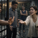 Sa kaliwa, isang binatang malakas tumawa habang nakaturo sa kanya, parang nanalo sa sariling joke. Sa tabi nito, may babae na tinatakpan ang bibig, hindi para pigilan ang tawa—para lang magmukhang “disente” habang nanlalait. Sa likod nila, nakatayo ang isang matandang lalaki, seryoso ang mukha, nakamasid na parang alam niya kung gaano kabigat ang nangyayari pero wala siyang boses para pigilan ang lahat. Sa paligid, may mga batang nagtatakbuhan, may mga upuang plastik na nakahanay, at sa dulo, may maliit na stage na may microphone—yung mic na akala ng lahat, pang-announce lang ng palaro. Hindi nila alam, may ibang pangalan ang tatawagin doon. At kapag nangyari ‘yon, may mga ngiting mapuputol.