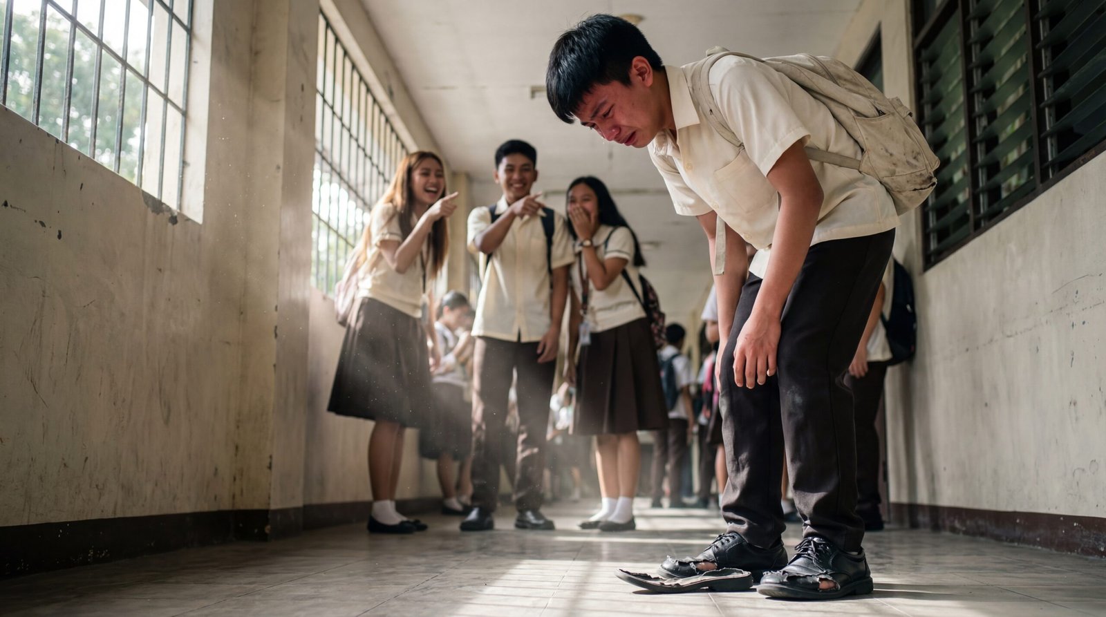 May mga araw sa eskwela na hindi exam ang sumusubok sa’yo—kundi mata ng kapwa mo estudyante. Sa mahabang corridor na may mga bintanang bakal at liwanag na tumatama sa alikabok sa hangin, may isang binatang nakayuko, nanginginig ang balikat, at pinipigilan ang iyak habang nakatitig sa sapatos niyang halos humiwalay na ang swelas. Sa harap ng mga paa niya, nakabuka ang butas-butas na sapatos na parang bibig na hindi na kayang magsinungaling: mahirap siya. Sa likod, may tatlong estudyanteng naka-uniform na nagtatawanan, nagtuturo, at nagkakatuwaan na parang ang kahihiyan ng iba ay entertainment. Sa gilid ng hallway, may mga estudyanteng dumaraan, may ilang nakatingin, may ilang umiwas—pero karamihan, tahimik. Ang tanong: kapag ang mundo tumingin sa’yo mula ulo hanggang paa, paano mo babangon kung ang pinagtatawanan nila… ay yung mismong pinaglalaban mo?