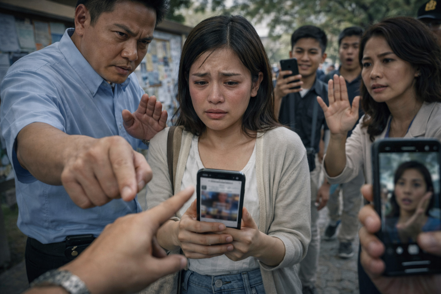 Sa kaliwa niya, isang lalaking naka-blue na polo—may tindig ng awtoridad at boses na sanay masunod—nakaturo ng madiin, parang hatol ang daliri. Sa kanan, isang babaeng may ID lanyard, nakataas ang palad na parang traffic enforcer—hindi para pigilan ang crowd, kundi para pigilan ang estudyante na magpaliwanag. Sa likod, may mga estudyante na nakanganga sa gulat at aliw; may isa pang nakatutok ang phone, nagre-record, sabik na sabik makakuha ng “scandal” na ikukuwento sa GC mamaya.