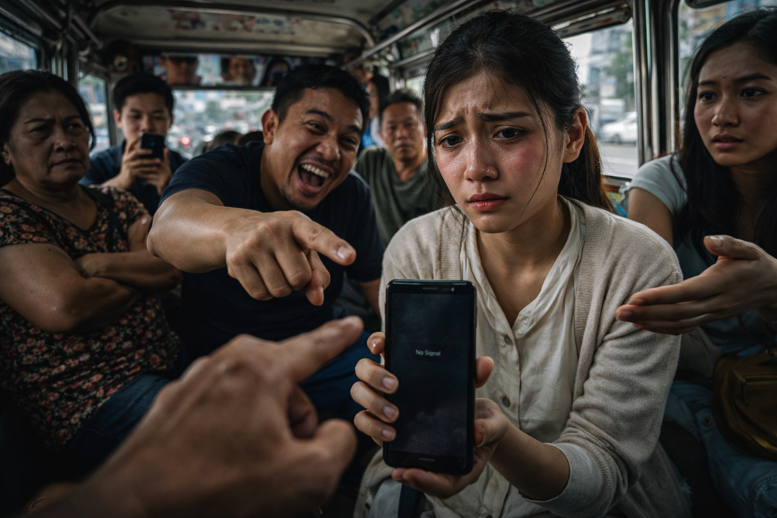 May isa pang daliring pumasok sa eksena mula sa harap—nakaturo rin, mas malapit, mas mapanulsol—parang gusto pang idiin ang kahihiyan sa mukha ng dalaga. Sa gilid niya, isang babae ang nakaabot ang kamay na parang sinasabing “O, ano ngayon?” habang ang iba’y nakatingin nang may halong inis at aliw. Sa kabilang banda, may isang pasaherong tahimik na nakataas ang cellphone—hindi para tumulong, kundi para mag-record. Kasi sa panahon ngayon, ang kahihiyan, ginagawang content.