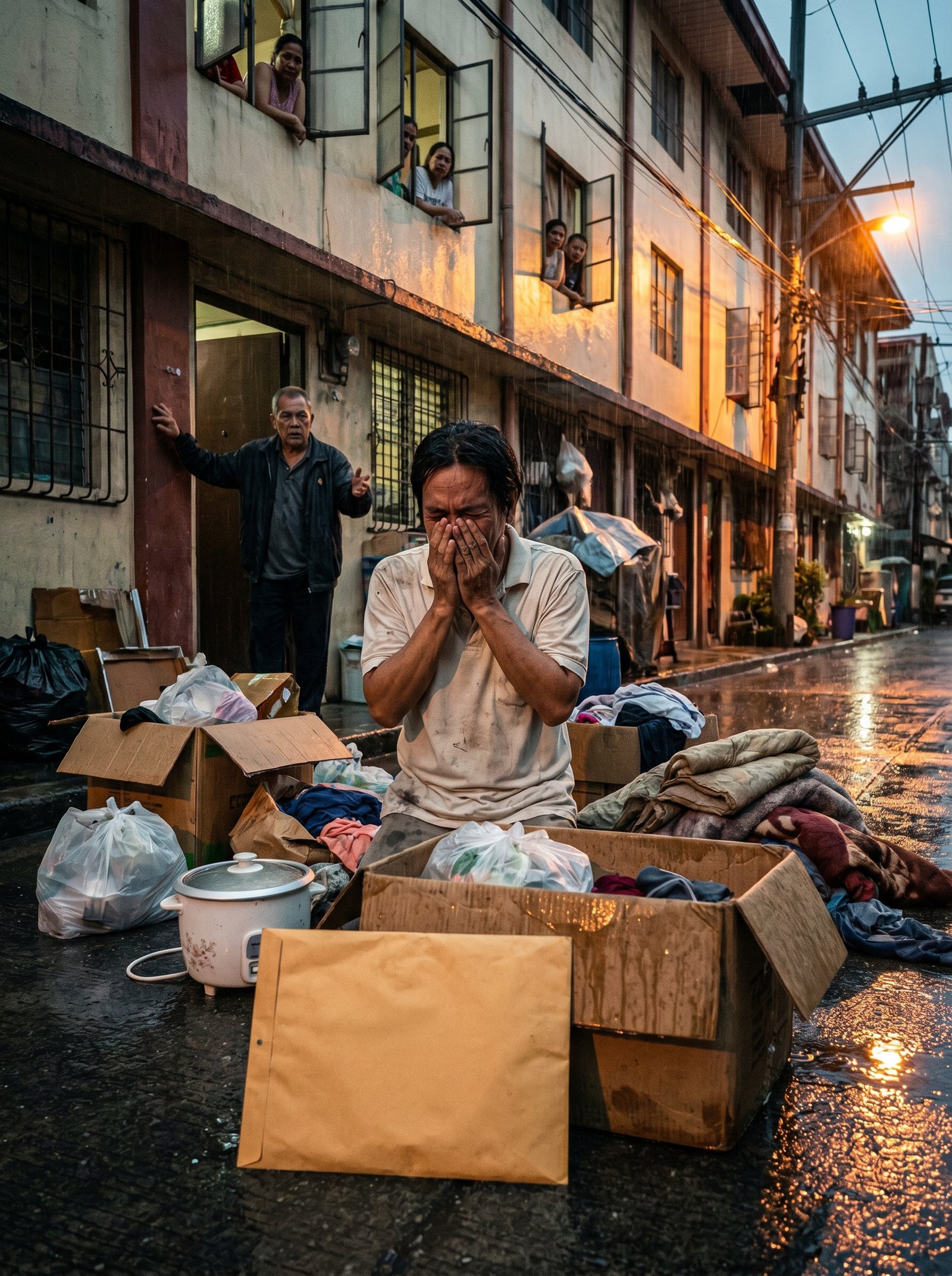 Sa makipot na eskinita sa harap ng lumang apartment, sa ilalim ng manipis ngunit tuloy-tuloy na ulan, nagkalat ang buong buhay ni Lando sa semento. May mga kartong lumambot na sa tubig. May mga plastik na supot na may lamang damit. May lumang rice cooker na naitabi na lang sa gilid. May mga kumot na unti-unting binabasa ng ulan. At sa gitna ng lahat, nakaluhod halos ang isang lalaking mahirap na nga, pinahiya pa sa harap ng buong gusali.