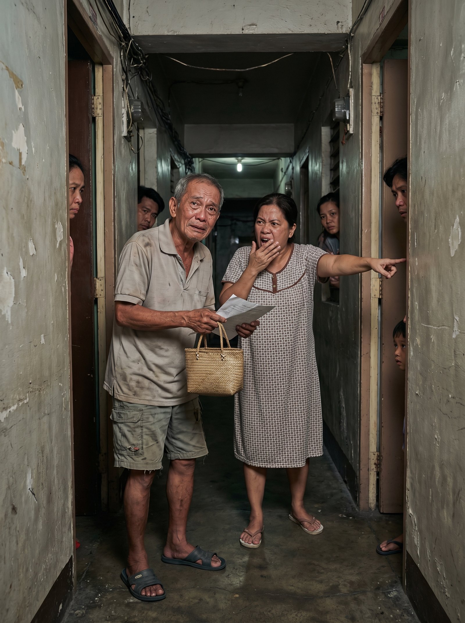 Pagdating niya sa makitid na pasilyo, sumilip ang ilang nangungupahan mula sa kani-kanilang pintuan. May batang sumilip sa siwang. May isang ina na napahinto sa paghuhugas ng pinggan. Lahat sila ay napatingin sa matandang halatang walang dalang karangyaan kundi dangal at pagod.