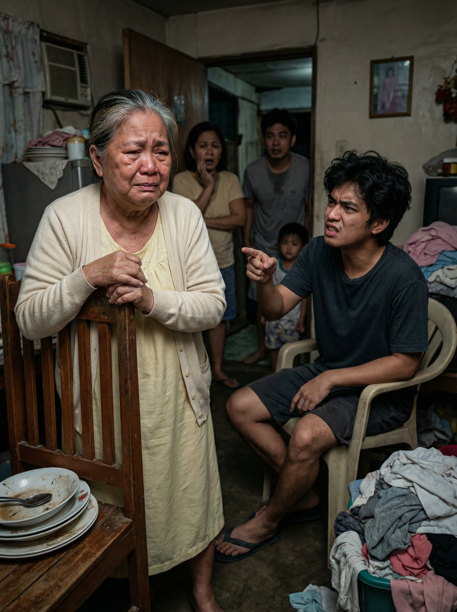 Hindi alam ni Aling Pasing kung alin ang mas mabigat sa dibdib niya sa gabing iyon—ang hapdi ng mga salitang ibinabato sa kanya, o ang hiya na nararamdaman niya sa harap ng sariling mga anak at apo. Nakatayo siya sa gilid ng lumang kahoy na silya, mahigpit ang kapit sa sandalan nito, habang ang luha ay tuluy-tuloy na bumabagsak sa mga matang ilang taon nang sanay magtiis. Sa harap niya, nakaupo sa puting monobloc si Jomar, ang manugang niyang ilang buwan nang tingin ng lahat ay pabigat lang sa bahay. Magulo ang buhok nito, lukot ang damit, at ang daliri nito ay nakaturo sa kanya na parang siya pa ang may kasalanan sa lahat. Sa paligid nila, makikita ang mga maruming pinggan sa mesa, ang tumpok ng damit sa gilid, ang lumang aircon na halos hindi na lumamig, at ang makipot na sala na parang hindi na kasya sa dami ng problemang nakatambak doon. Sa pintuan, nakatayo ang asawa niyang si Liza, ang bayaw nitong si Carlo, at maging ang maliit na batang apo na hindi maunawaan kung bakit parang gumuho ang gabi sa loob ng sarili nilang tahanan.