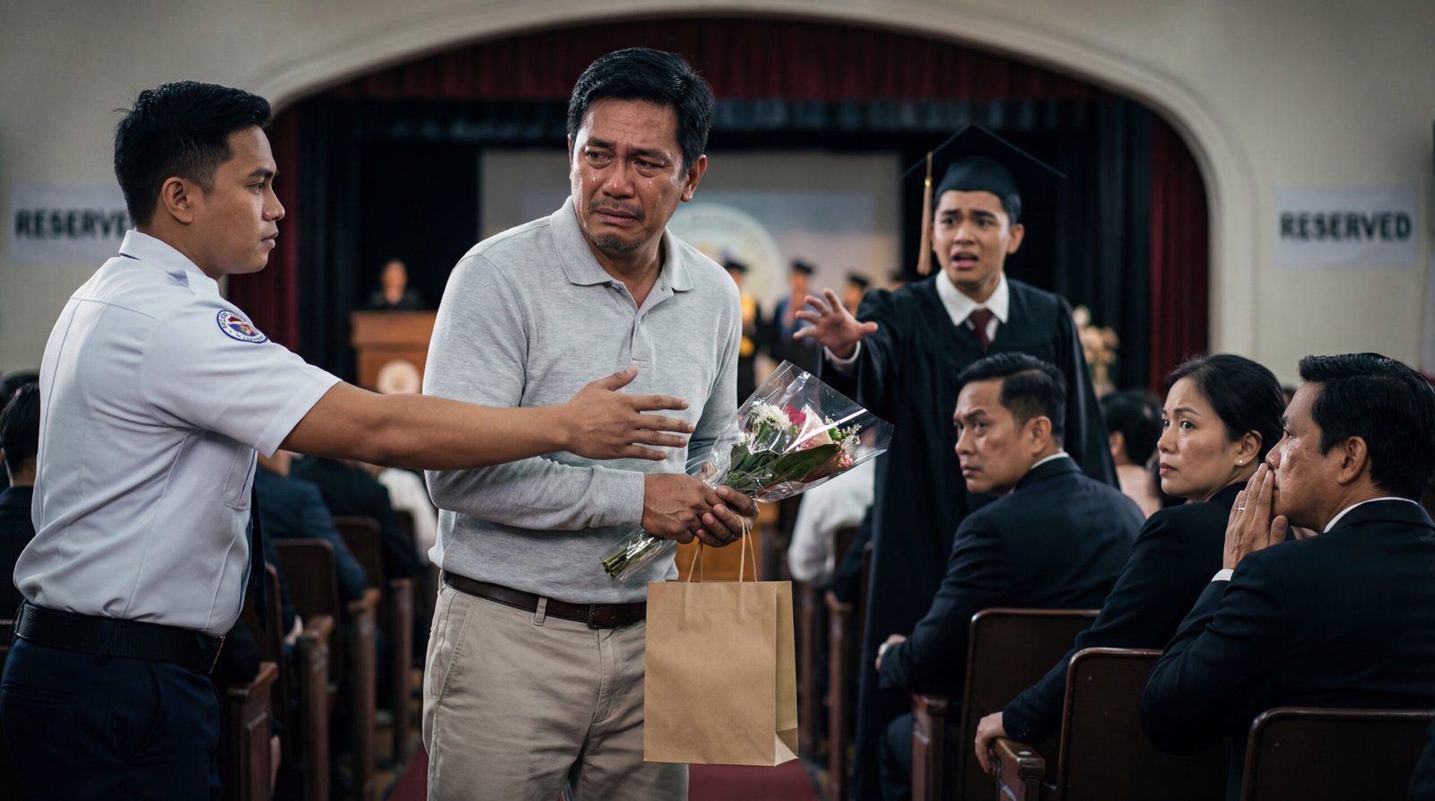 May mga sandali na kahit graduation march ang tugtog, parang funeral march ang bigat sa dibdib mo. Sa gitna ng bulwagan—sa pagitan ng pulang carpet at mga upuang may karatulang RESERVED—nakahinto ang isang tatay na may hawak na bouquet at paper bag, nangingilid ang luha, habang isang guwardiya ang nakaharang at nakalahad ang kamay na parang pader. Sa likod niya, isang binatang naka-toga at sumbrero ang halos maghabol, nakaunat ang palad na parang humihingi ng isang minuto. Sa mga upuan sa gilid, may mga gurong nakapormal, may mga nakatingin na may pagkabigla, may isang nakapikit na parang nagdadasal—at sa loob ng ilang segundo, ang pinakamahalagang araw ng anak ay magiging araw ng pinakamalupit na hiya ng ama.
