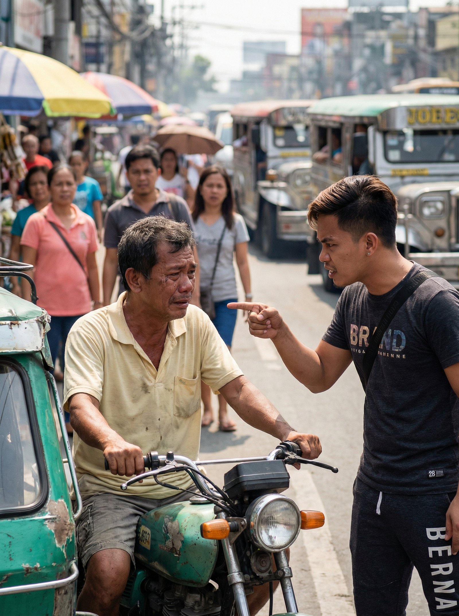 Hindi na halos mahawakan ni Mang Nardo nang maayos ang manibela ng lumang tricycle sa tindi ng panginginig ng mga kamay niya. Sa gitna ng maingay na lansangan, sa pagitan ng mga nagdaraang jeep, usok ng tambutso, at mga payong ng tindera sa bangketa, nakaupo siyang luhaan sa sidecar habang nakatayo sa harap niya ang isang binatang pasaherong ubod ng lakas ng boses. Nakasuot ito ng maitim na damit, may sling bag sa balikat, at nakaturo ang daliri sa mukha niya na para bang may malaking kasalanan ang matandang tsuper maliban sa pagiging pagod, pawisan, at mahirap tingnan. Sa paligid nila, unti-unting bumagal ang trapiko. May mga usisero nang huminto. May mga matang agad nang humusga. At gaya ng madalas mangyari sa kalsada, mas mabilis pang lumaki ang galit kaysa katotohanan.