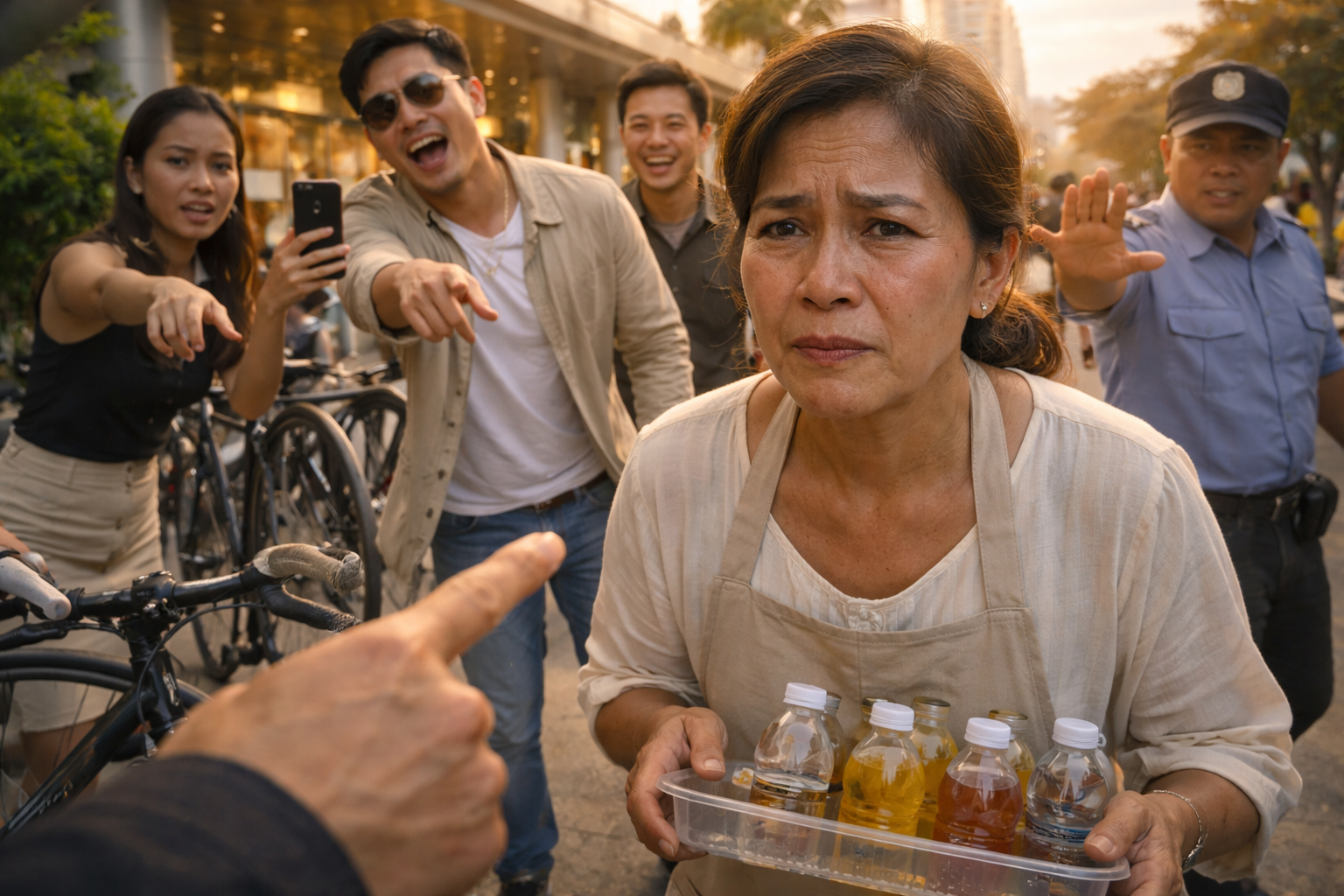 Sa harap, yung daliri sa foreground—malapit sa camera—nakaturo kay Minda na parang siya ang problema ng mundo. Si Minda, humigpit ang hawak sa tray. Hindi dahil gusto niyang manakit, kundi dahil ayaw niyang mabitawan ang kabuhayan niya. Bawat bote, puhunan. Bawat benta, bigas. Bawat araw na may gulo, maaaring araw na walang uuwi.