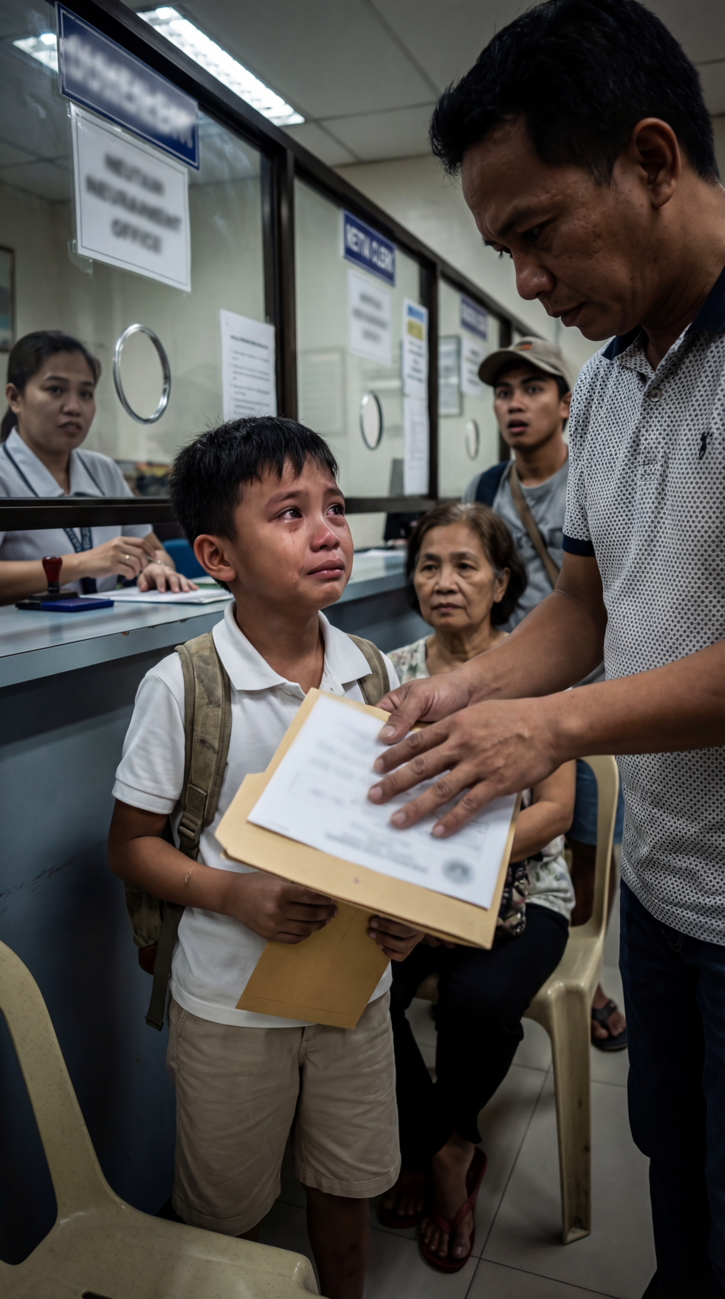 Sa loob ng isang opisina na amoy papel, tinta, at pagod ng mga taong matagal nang nakapila, may isang batang nakasuot ng puting polo at maliit na backpack ang nakatayo sa harap ng salaming may maliit na bilog na butas para sa boses. Pula ang mata niya, nangingilid ang luha, at halos mabasag ang dibdib sa pagpipigil ng hikbi habang yakap-yakap niya ang isang brown envelope at isang dokumentong nakapatong sa ibabaw. Sa harap niya, isang lalaking may mabigat na titig ang nakatungo, hawak ang papel at nakaturo sa bahagi na para bang may kulang—isang pirma, isang seal, isang patunay na hindi kayang ibigay ng bata. Sa likod ng salamin, isang empleyadang babae ang nakaupo, nakatingin nang diretso, parang sanay sa ganitong eksena—parang araw-araw may umiiyak, araw-araw may nawawalan ng pag-asa. Sa gilid, may matandang babaeng nakaupo sa plastic chair, tahimik, at may binatang naka-cap na nanlaki ang mata, tila ngayon lang nakakita ng batang umiiyak para sa isang bagay na hindi laruan o tsokolate—kundi buhay.